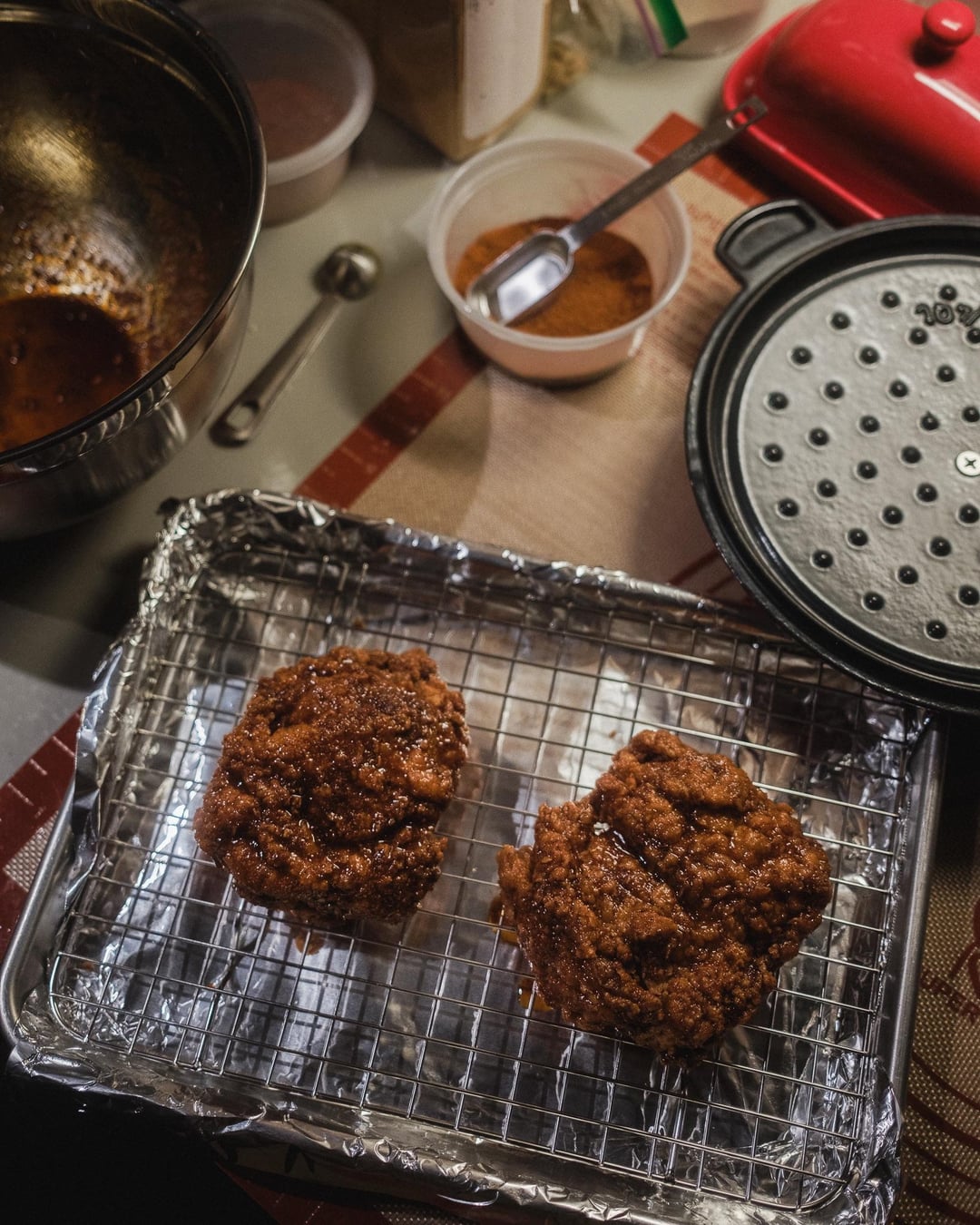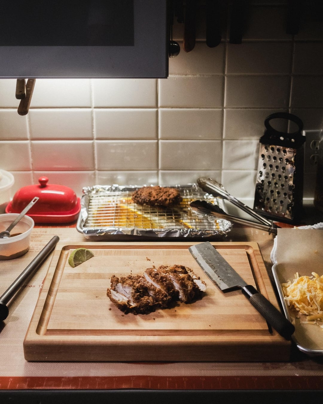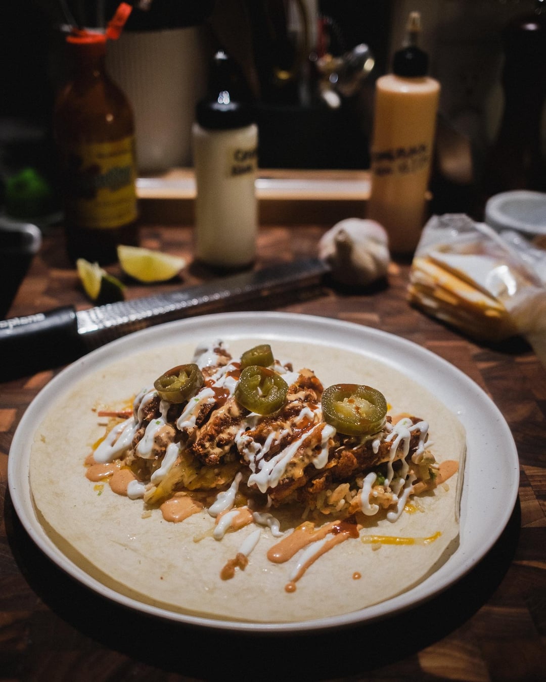 Had some fried chicken leftover from last night’s NHC sandos, so I switched it up by slicing it up and rolling it up (and adding cheese, jalapeños, and crema).