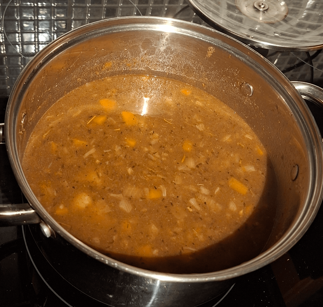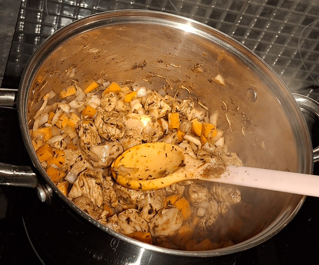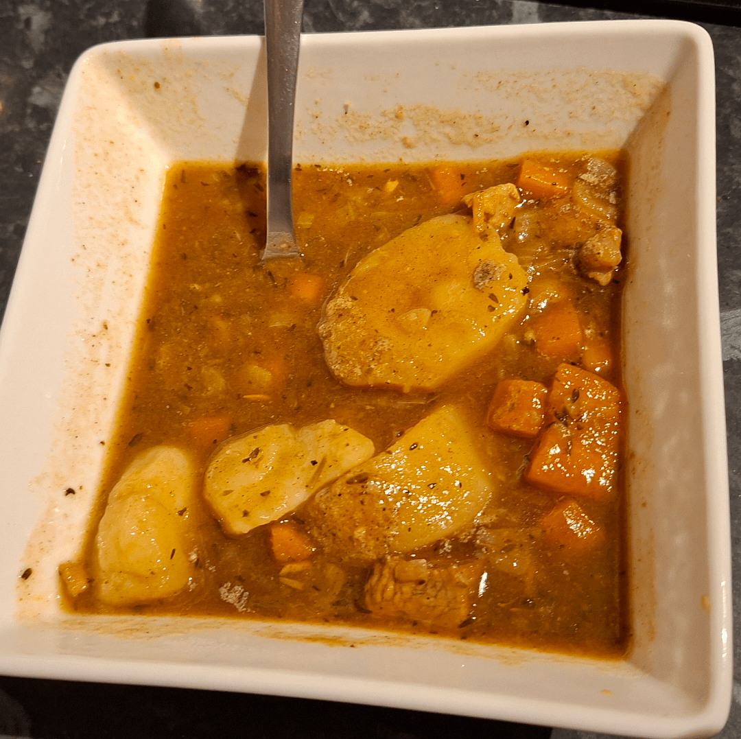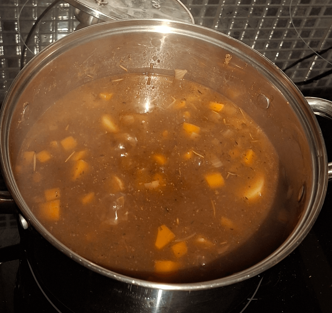v_FLAIVIE_v on November 14, 2025 4:10 am 2 chicken breasts, 3 small onions, 3 carrots, 3 potatoes, Tyme, Rosemary, Paprika, Cumin, Chicken stock, Chicken gravy,