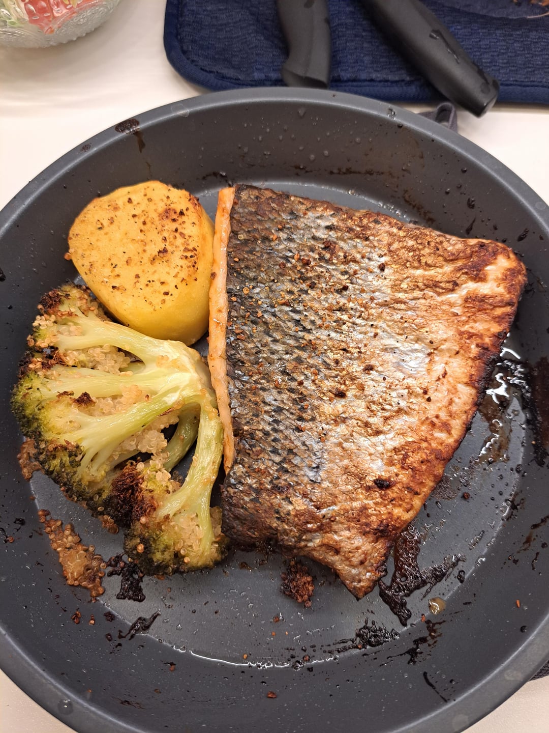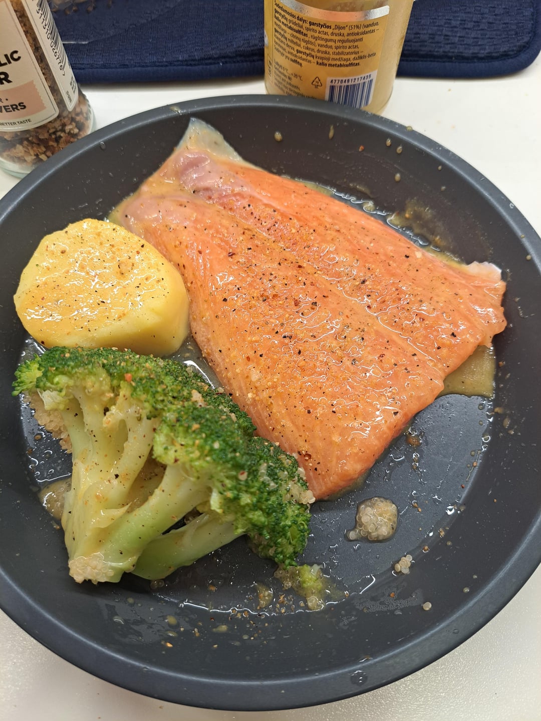 The whole baking plate with salmon, sweet and sour mustard glaze, biiled potato and broccoli is only 567 kcal. I ate half today.