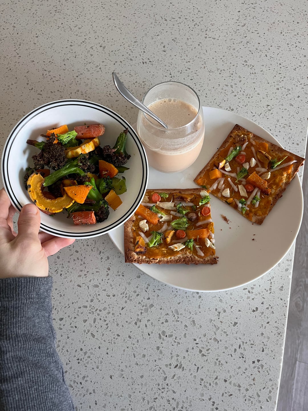 - Pumpkin & butternut squash pizza on half of the Trader Joe’s Lavash bread with cashew mozzarella shreds and toppings+side bowl of broccoli, carrots, garlic, and delicatta squash. And, ofc, my pea protein drink