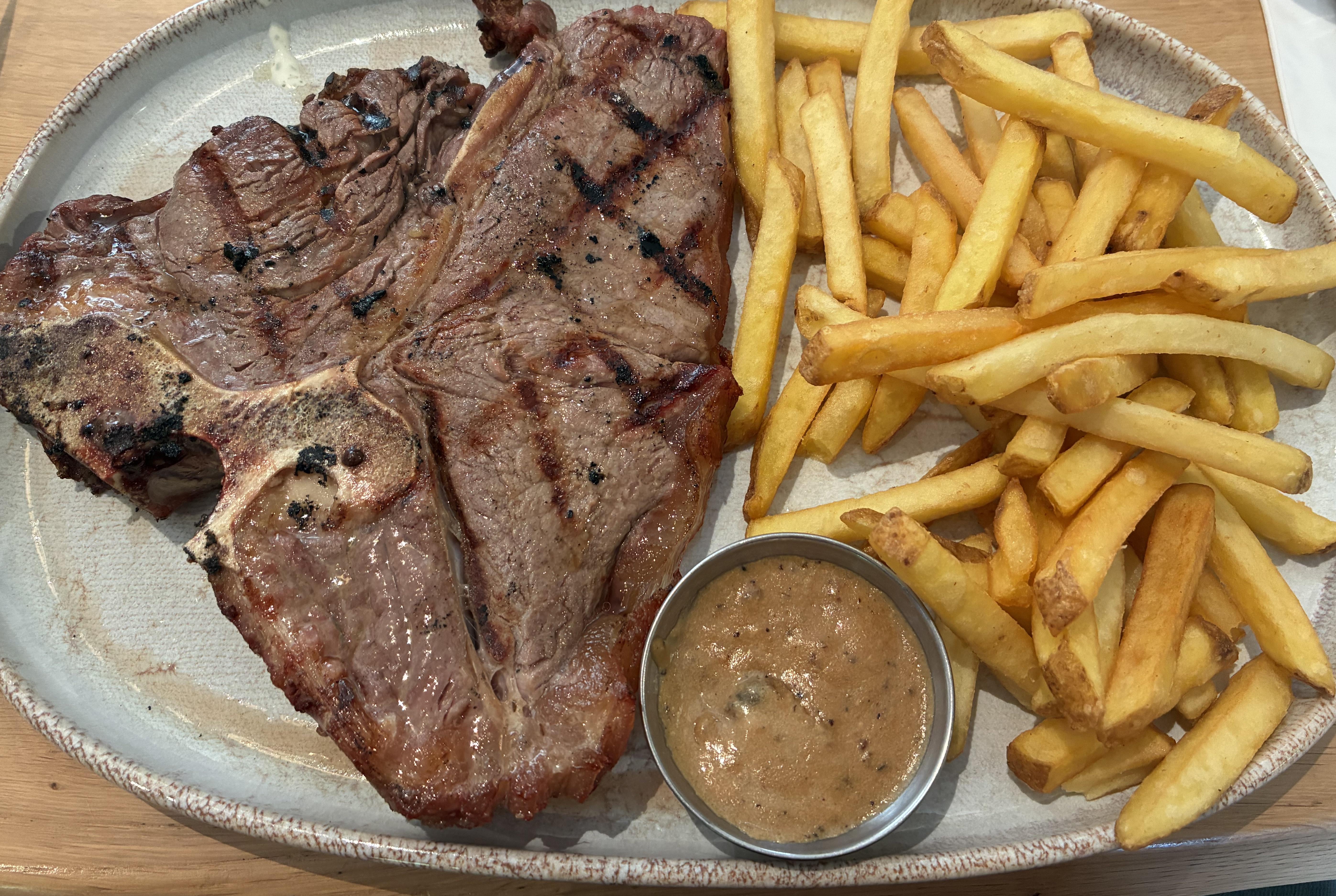 T-bone Steak with Sauce Pepper and French Fries.