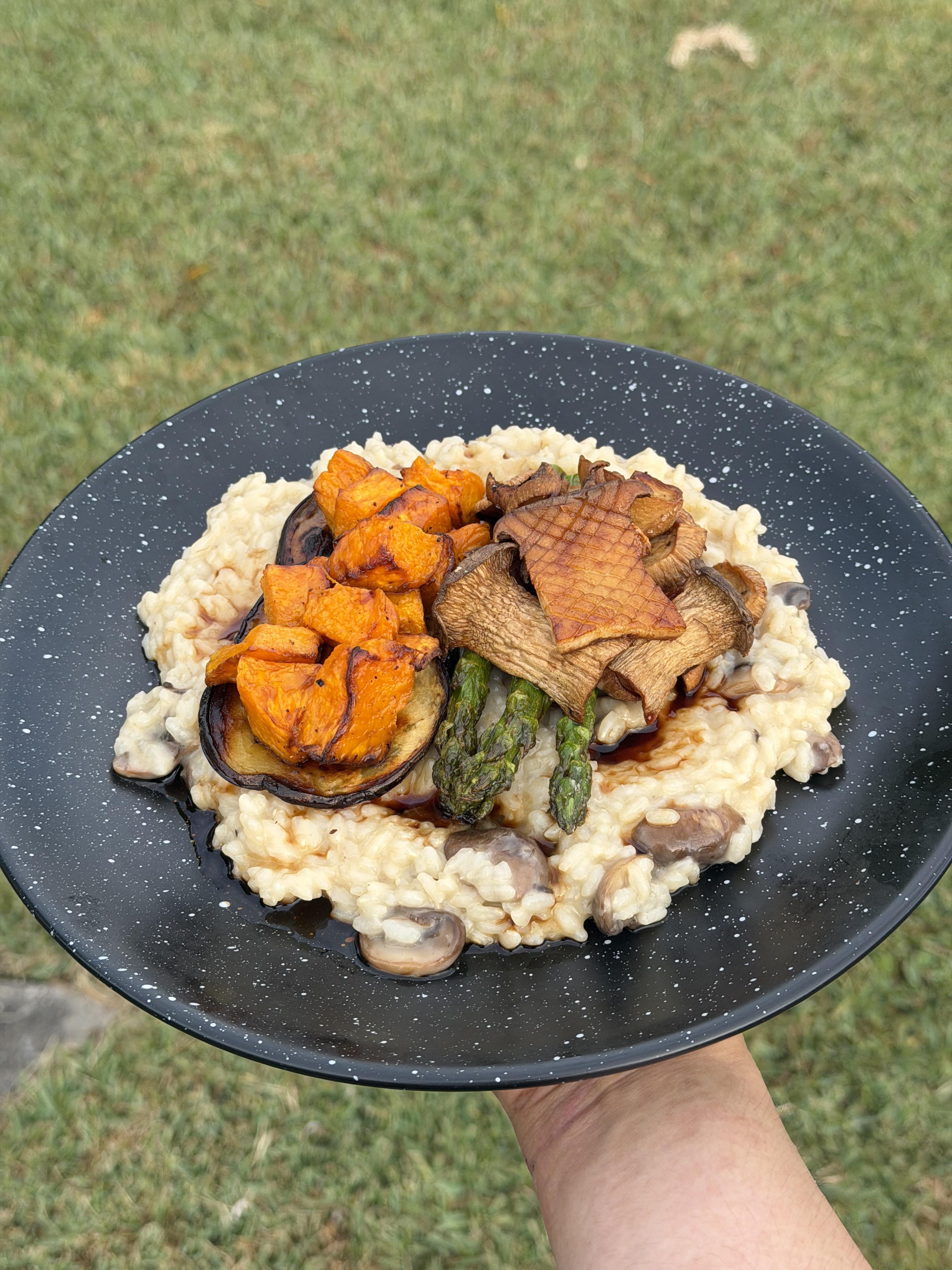Made it for my GF, top includes seared soy marinated eggplants, roasted pumpkin and king oyster mushrooms, sautéed asparagus, finished with a balsamic drizzle
