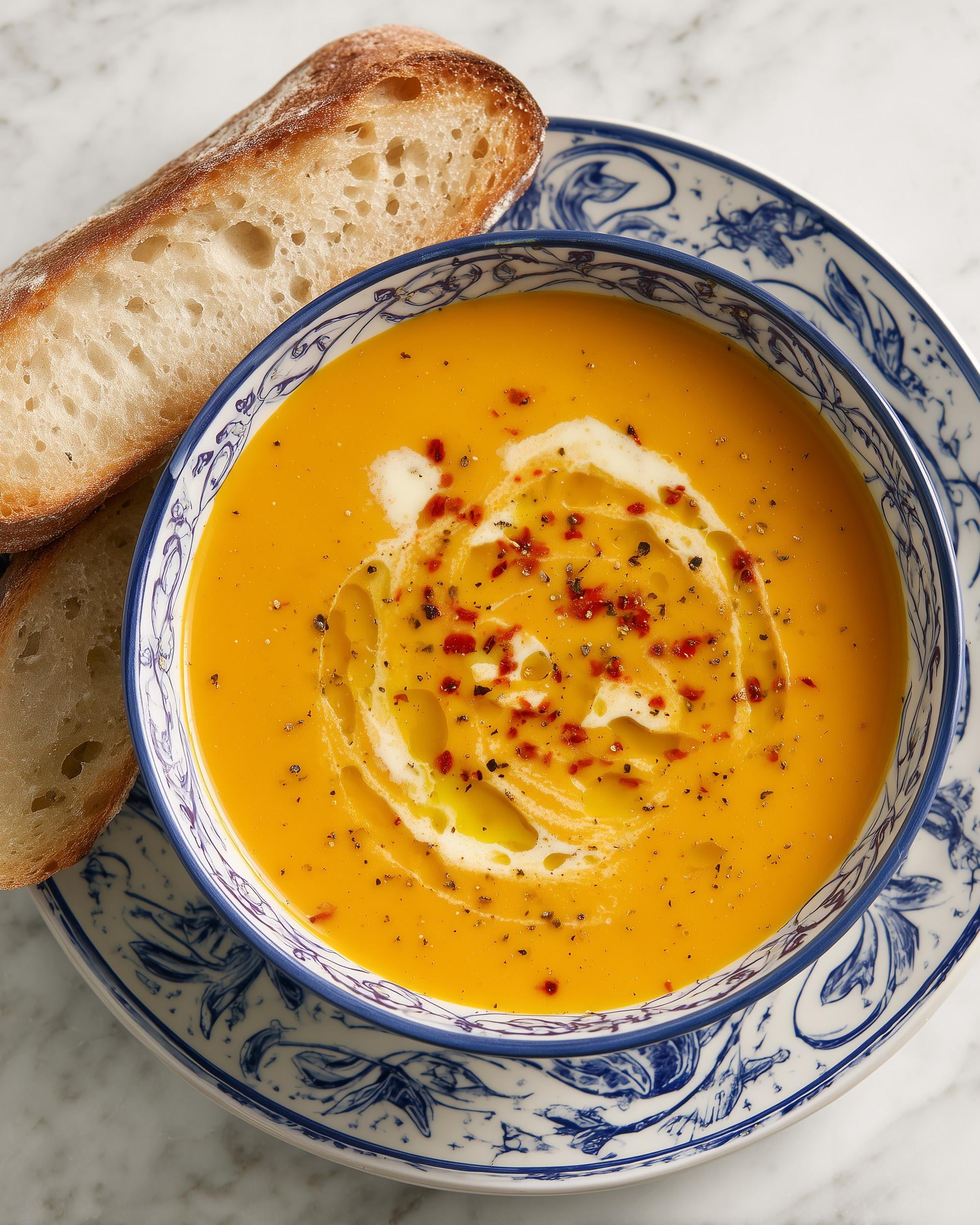 Ladle into bowls, swirl with oat cream, sprinkle chilli flakes, and drizzle olive oil. Serve with warm sourdough and enjoy!