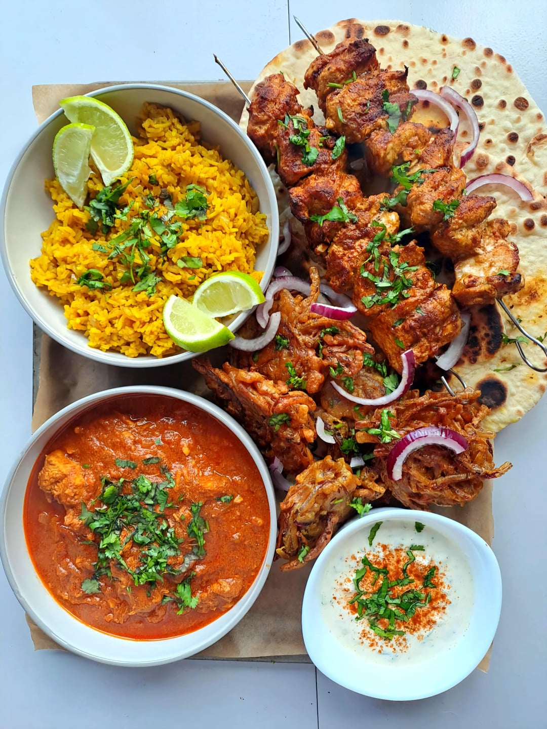 Artlistra on November 15, 2025 6:07 pm I made chicken tikka kebabs and chicken tikka masala with homemade naan, onion bhajis and pilau rice, served with raita ☺️
