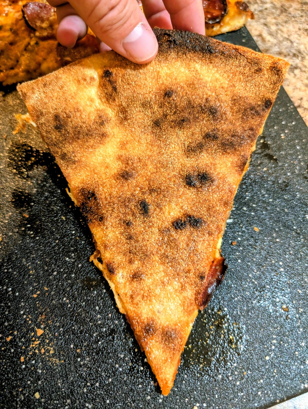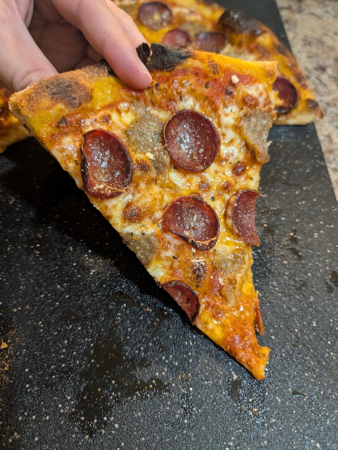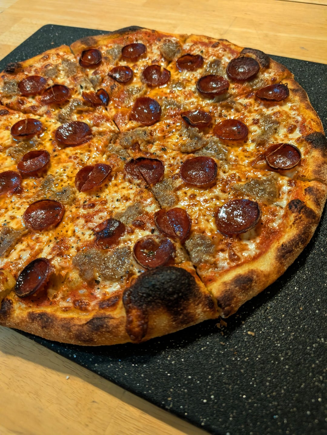Saturday night pep and sausage pie. Never ceases to amaze me that I can make this from my normal home oven. 14" pizza, 72 hour cold dough fermentation, baked on a steel in a home oven at 550F for 7 minutes.