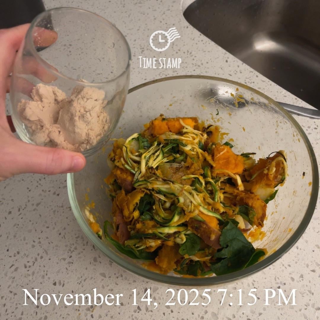 Pumpkin & butternut squash zoodle (zucchini) bowl with sweet potato, russet potato, spinach, coleslaw, and delicatta squash + pea protein powder