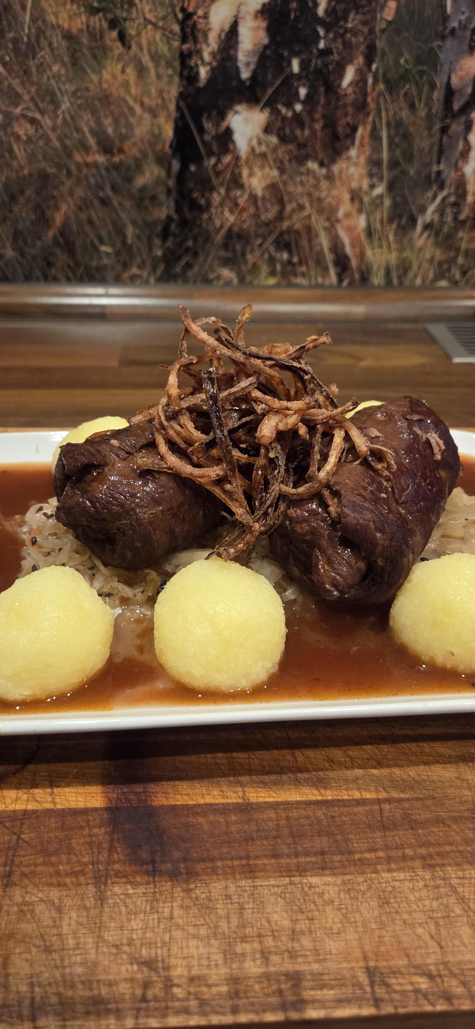 (homemade) Beef roulades in a red wine rum sauce with sauerkraut, Thuringian potato dumplings and fried onions by Obelisk3k Food Porn