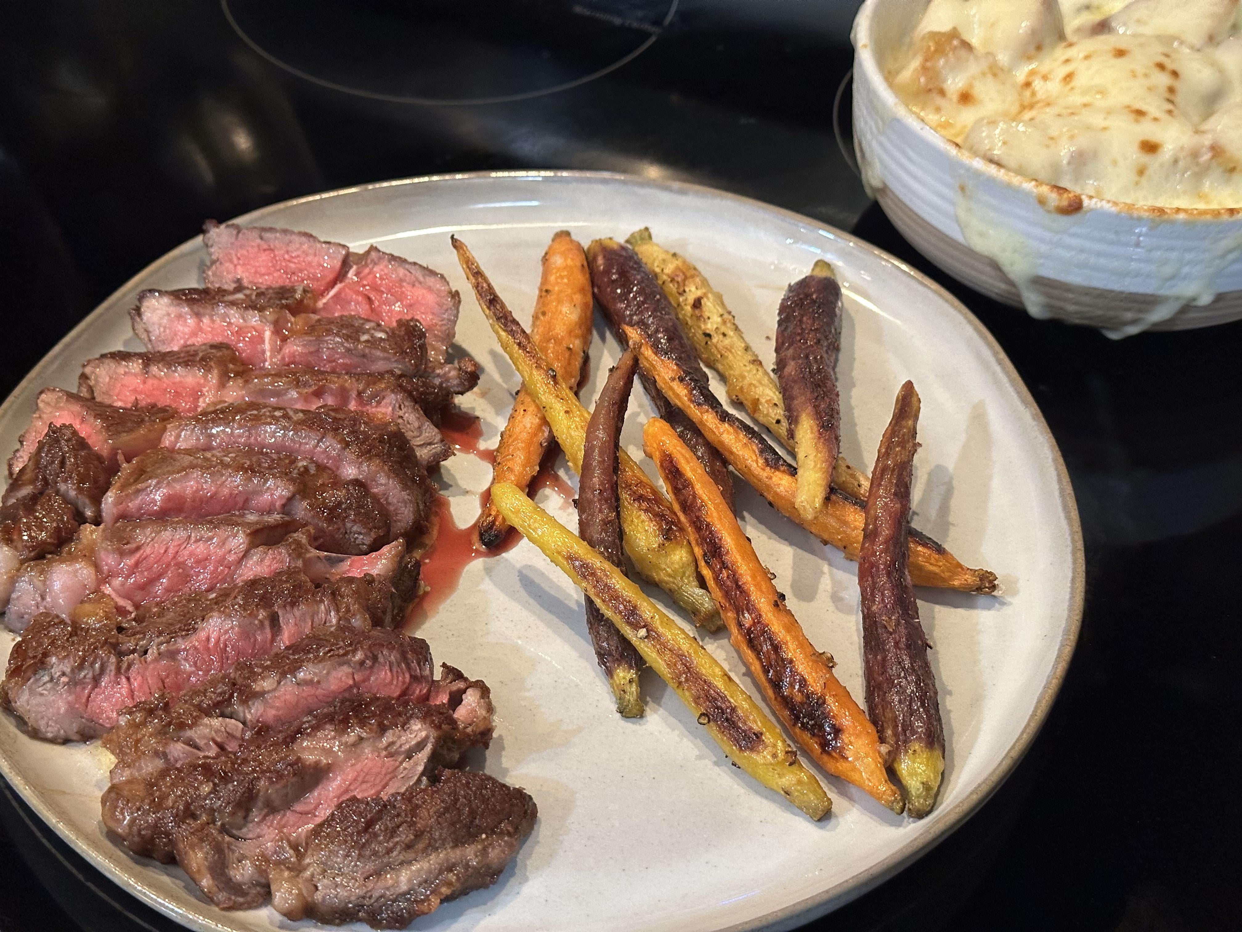 Steak, roasted carrots & French onion soup.