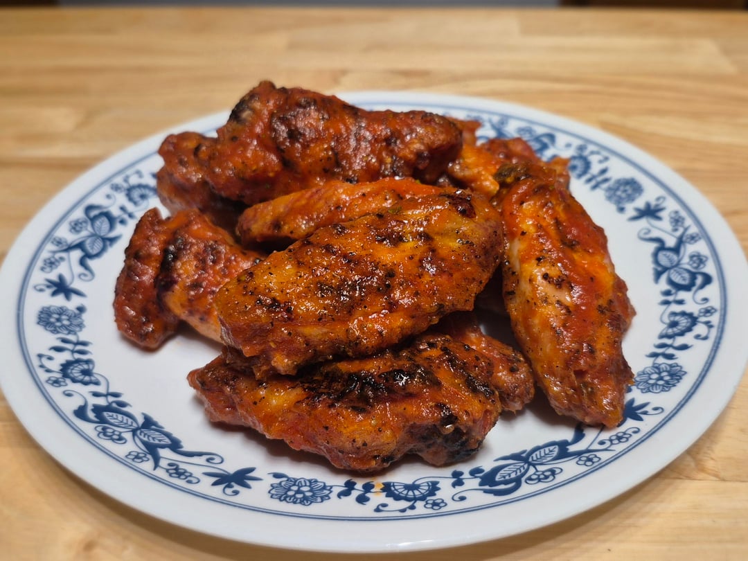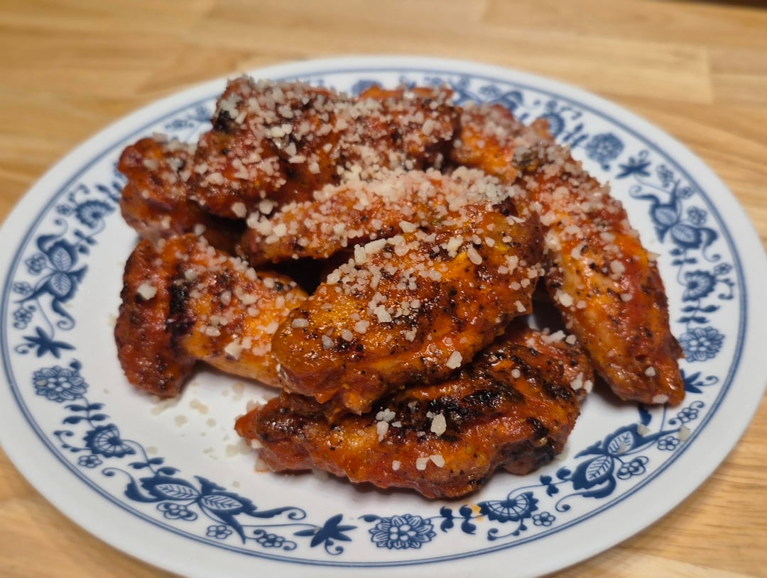 Half was semi-traditional with my fermented hot salsa and butter. Half was Italian with marinara and pecorino romano. The wings themselves were a bit small but I was happy with the result.