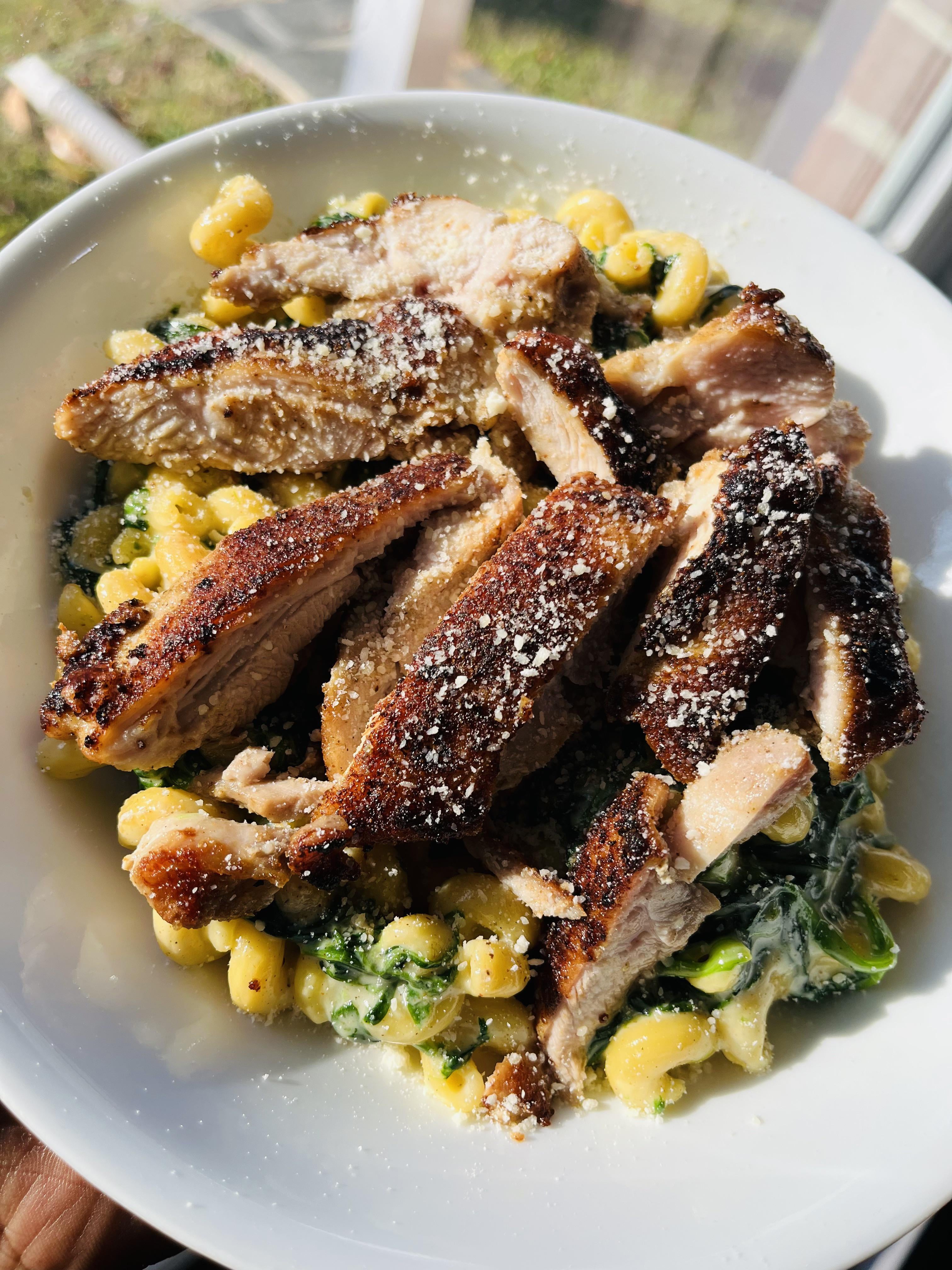 Creamy jerk chicken Cavatappi pasta with spinach topped with mozzarella.
