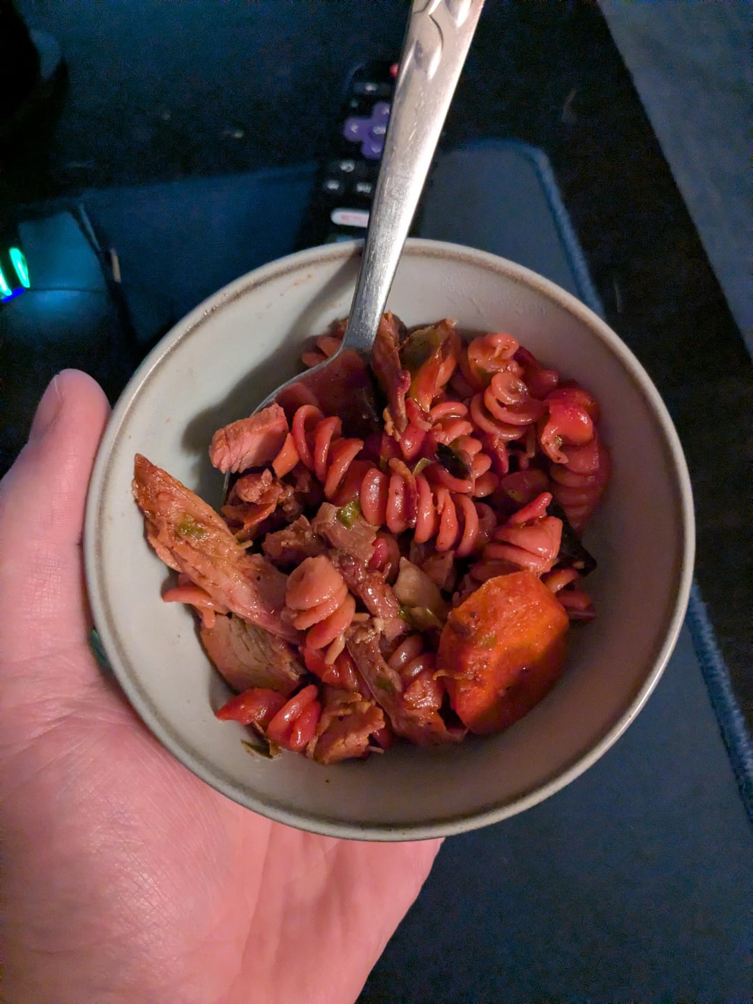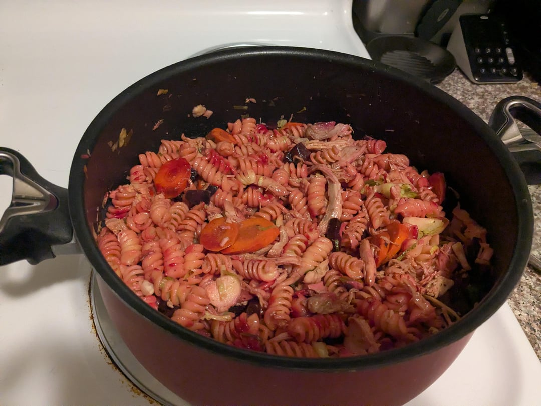 Roast chicken and veggies and gravy, with pasta. Pretty much everything I had left over from my Friendsgiving, since unsurprisingly, the mashed potatoes were completely devoured.
