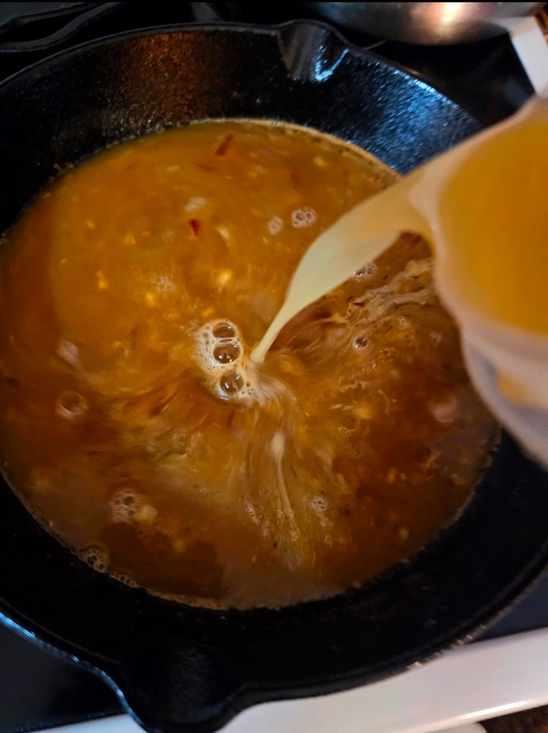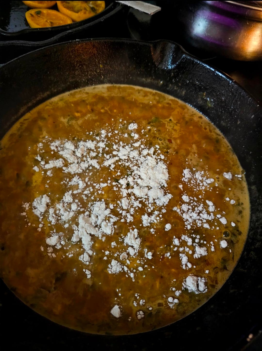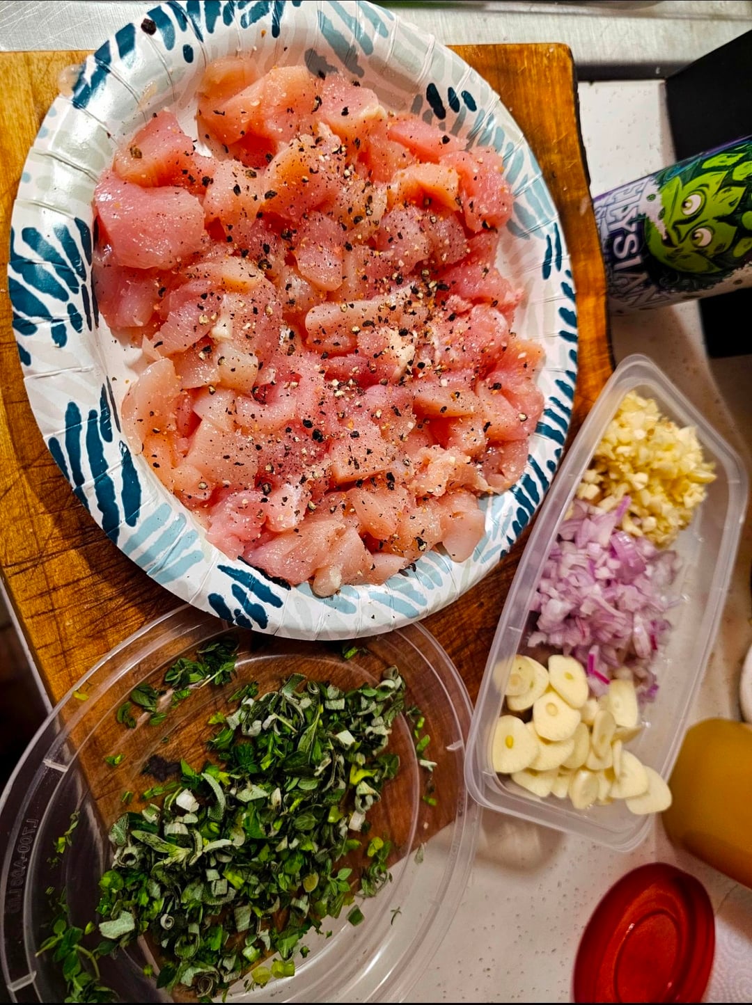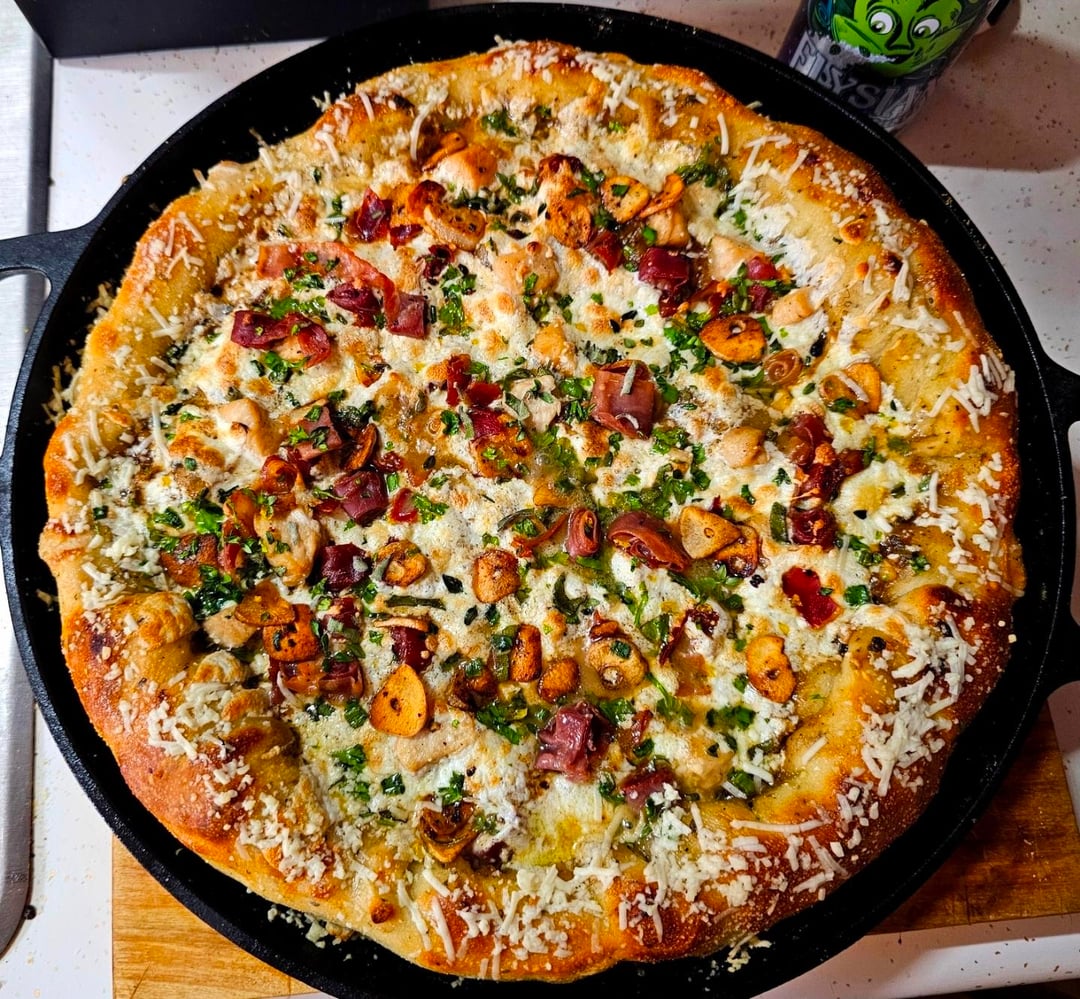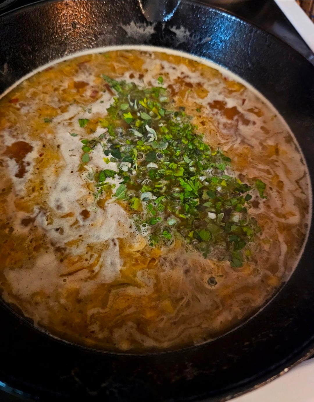 Add the herbs, chicken stock, and bring to a simmer, then whisk in some cream. Let it simmer with a lemon until the lemon gets soft in the middle, remove it, thicken with flour, salt & pepper to taste, this will be the pizza sauce 😆