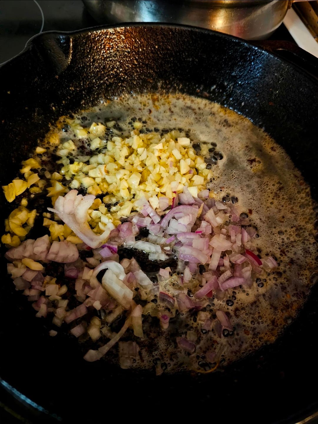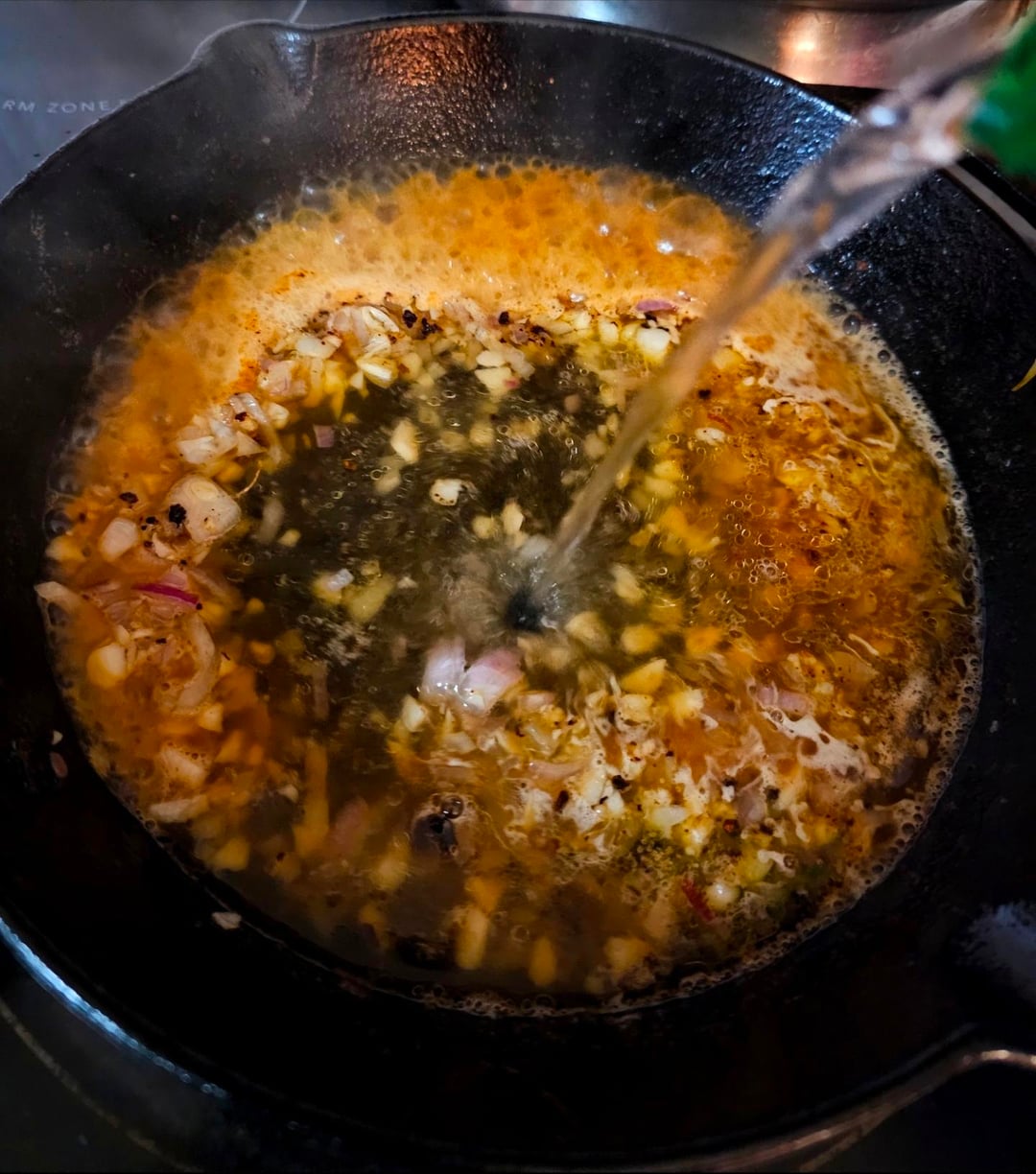 In the same pan melt butter then add the minced garlic and shallot. Cook until fragrant, deglaze with white wine, and scrape up any bits stuck to the bottom.