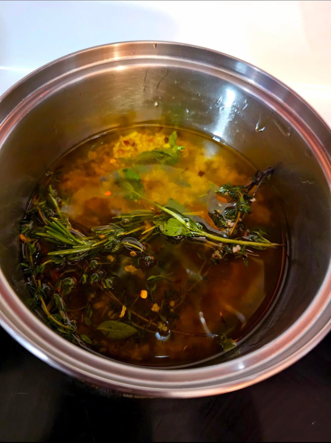 The garlic/herb olive oil is optional but I got a bunch of fresh herbs from a friends garden and was planning to make it anyway, so throw a bunch of minced garlic and fresh sprigs of rosemary & thyme into a pot of olive oil on low-medium heat and let it chill on the back burner while everything cooks.