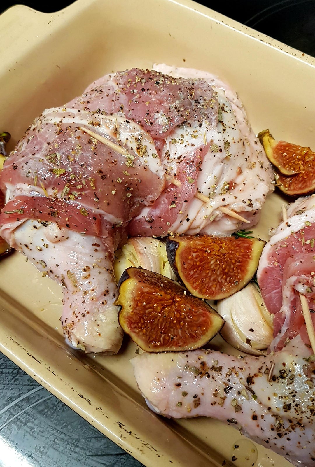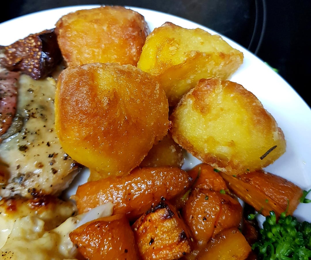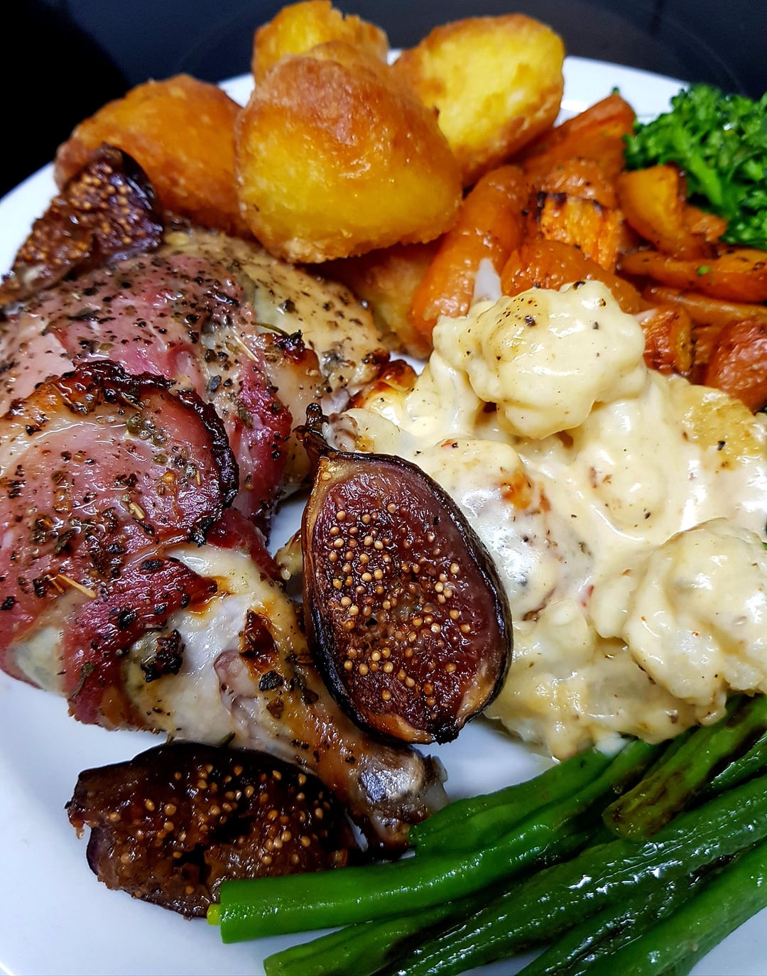 Roast Chicken Leg with Bacon and Figs, Duck Fat Potatoes, Glazed Carrots, Cauli Cheese, Sautéed Broccoli and Green Beans. White Wine Gravy.