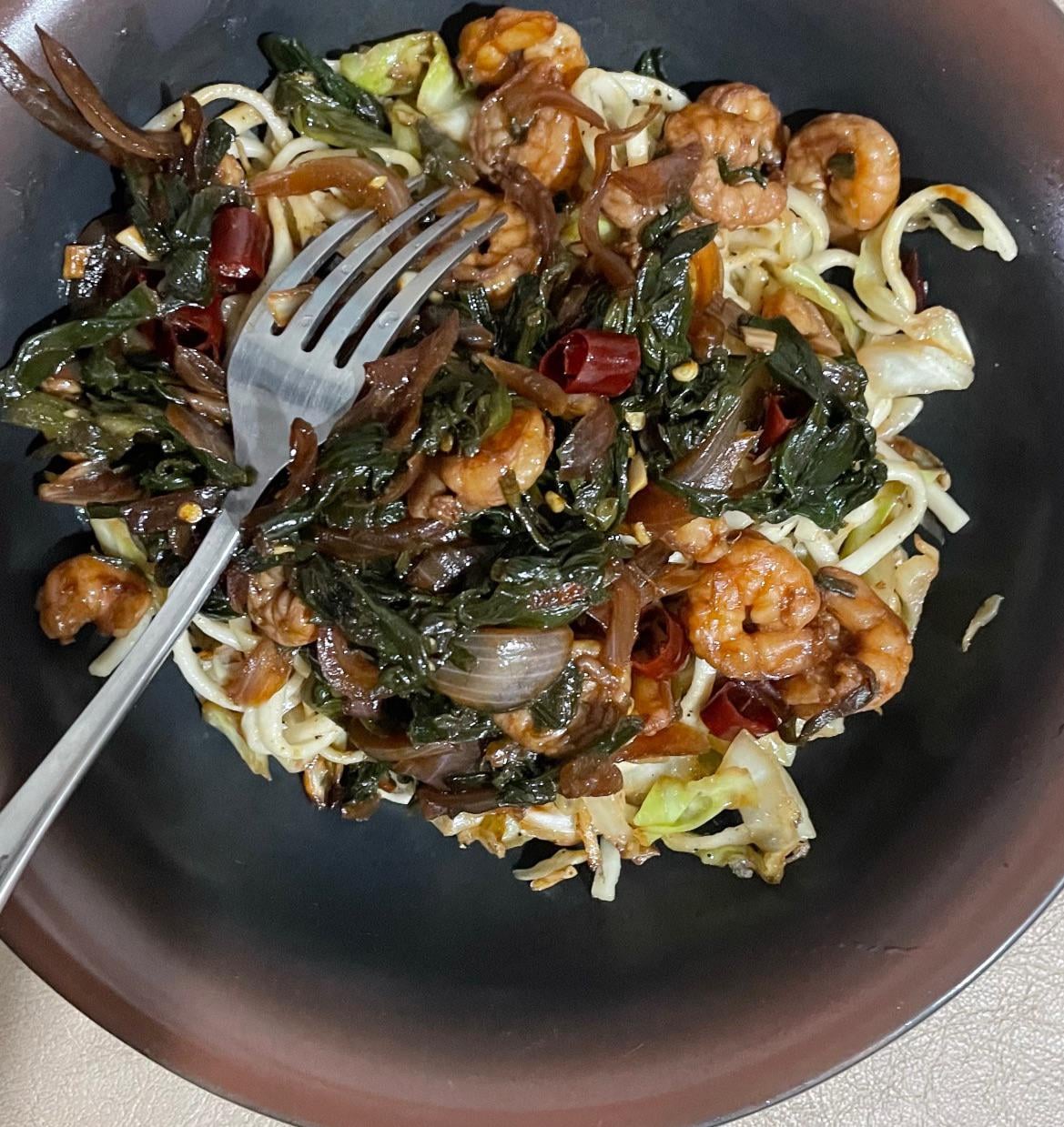 [homemade] Lo mein noodles, stir fried cabbage and spring onions, prawns in soy sauce by PuzzleheadedTask2675 Food