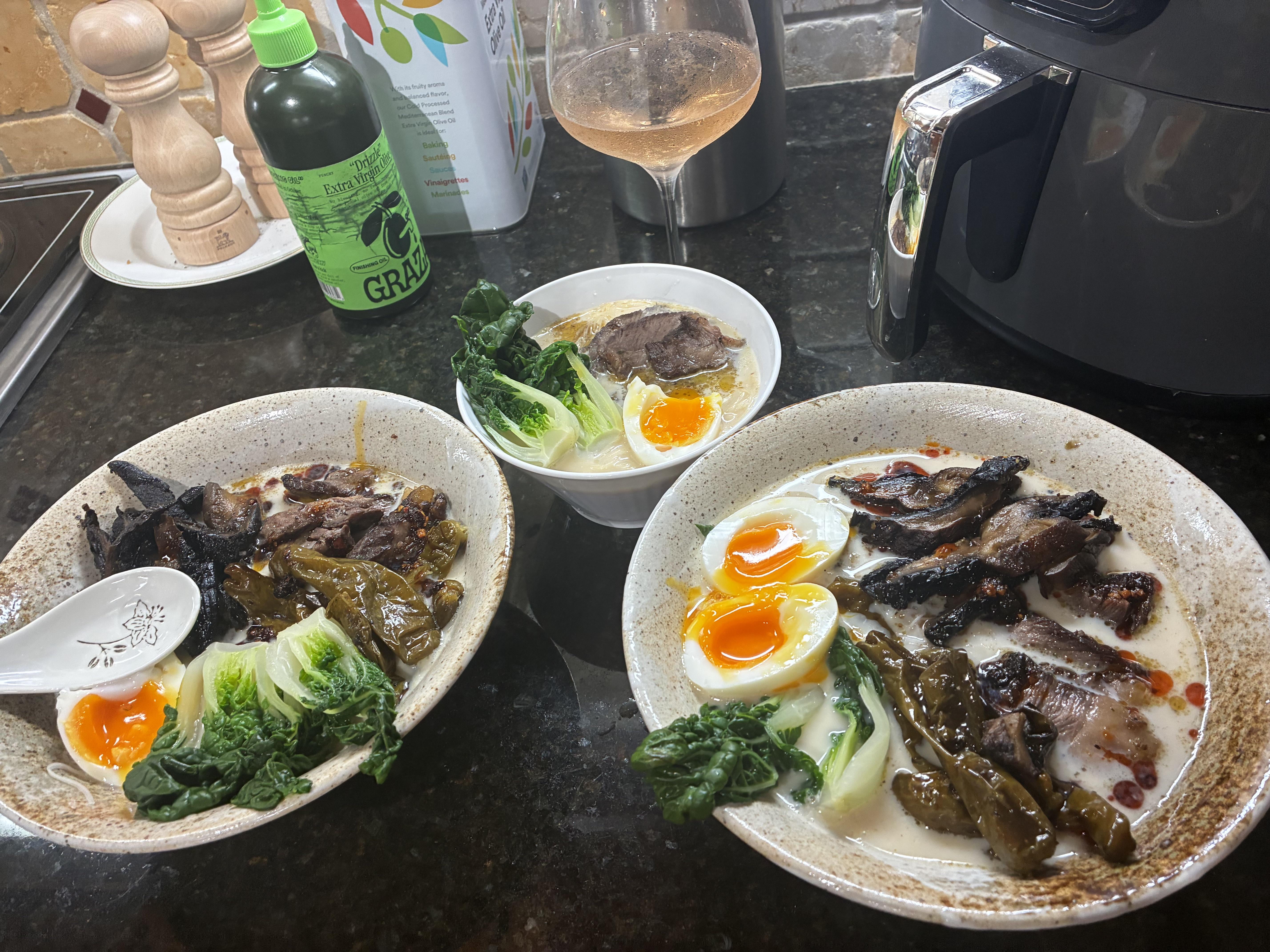 Grilled ribeye steak ramen with portobellos, shishitos, bok choy, and jammy egg by Ease_Head Dinner Tonight Tonight's Dinner