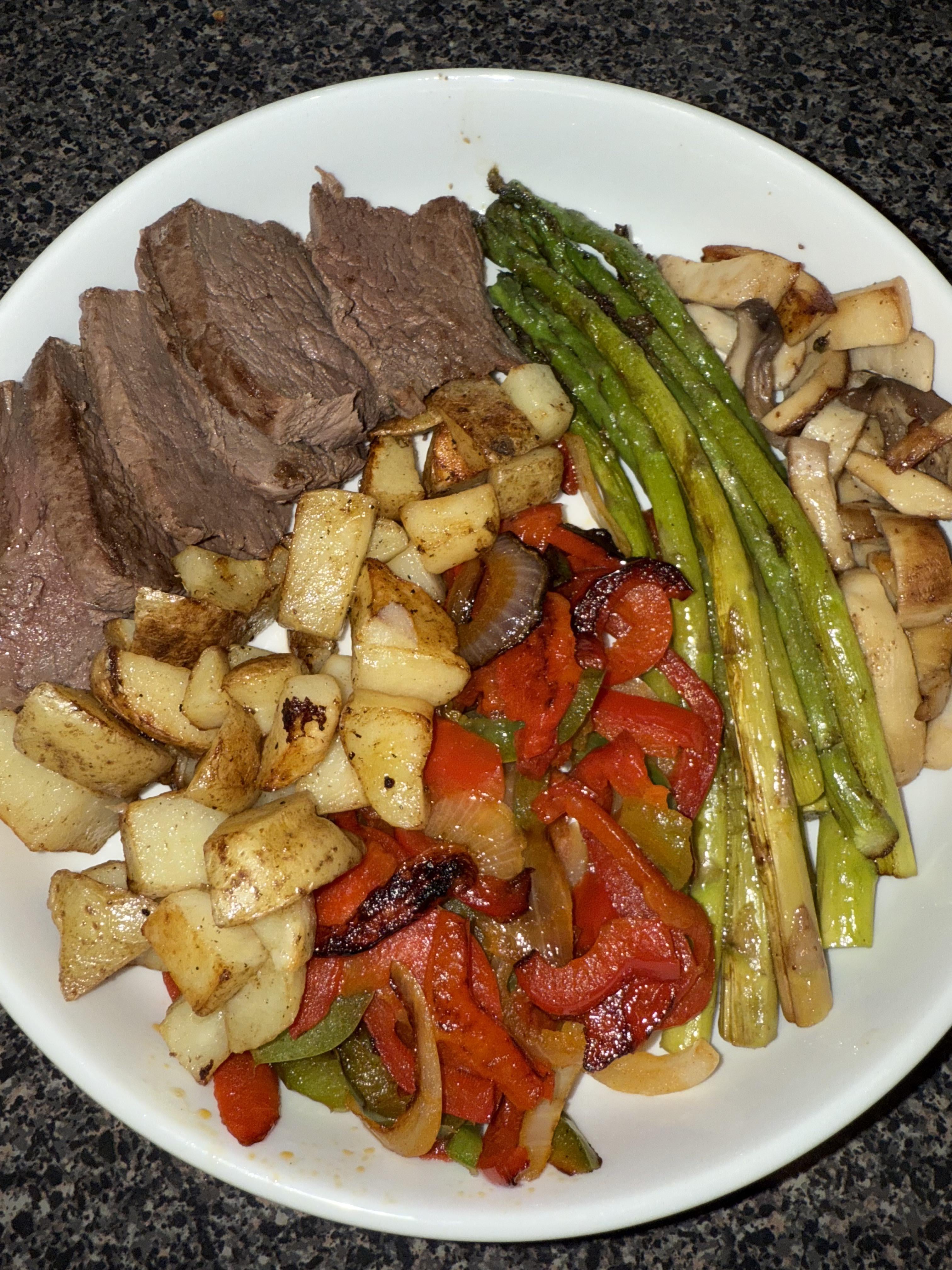 Bison steak with grilled Portobello mushrooms, asparagus, red and green peppers and onions. by LowerEngineering9999 Dinner Tonight Tonight's Dinner