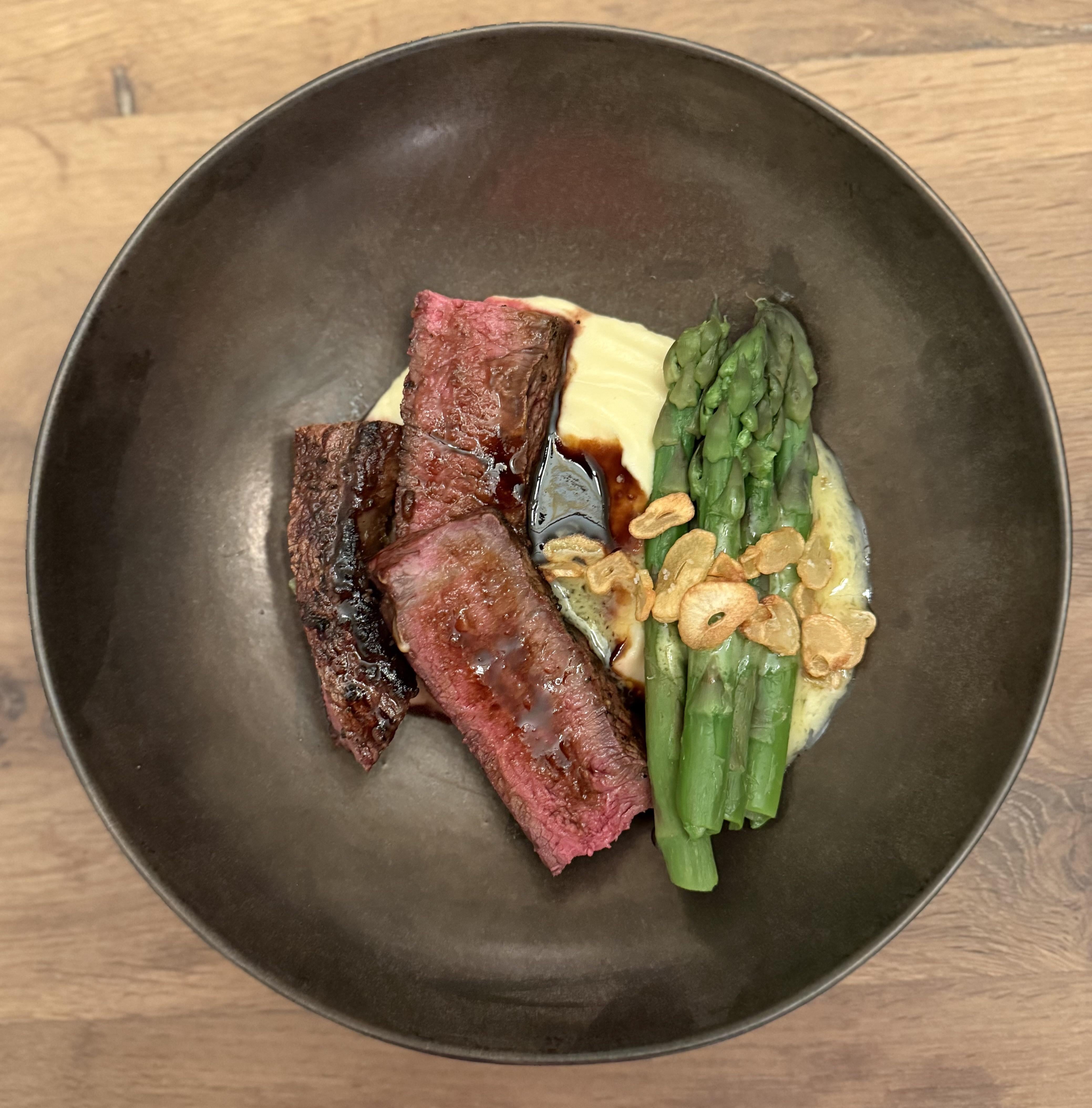 To upgrade the dish I’d remove the beurre blanc and give the asparagus some more attention. Either blanche them really short and throw them in ice water or bake them in a pan and glace (hope I’m using the right term. If not: cook them on high heat and when they’re nearly done throw in some drops of stock and a knob of cold butter to create a buttery glazing) them.