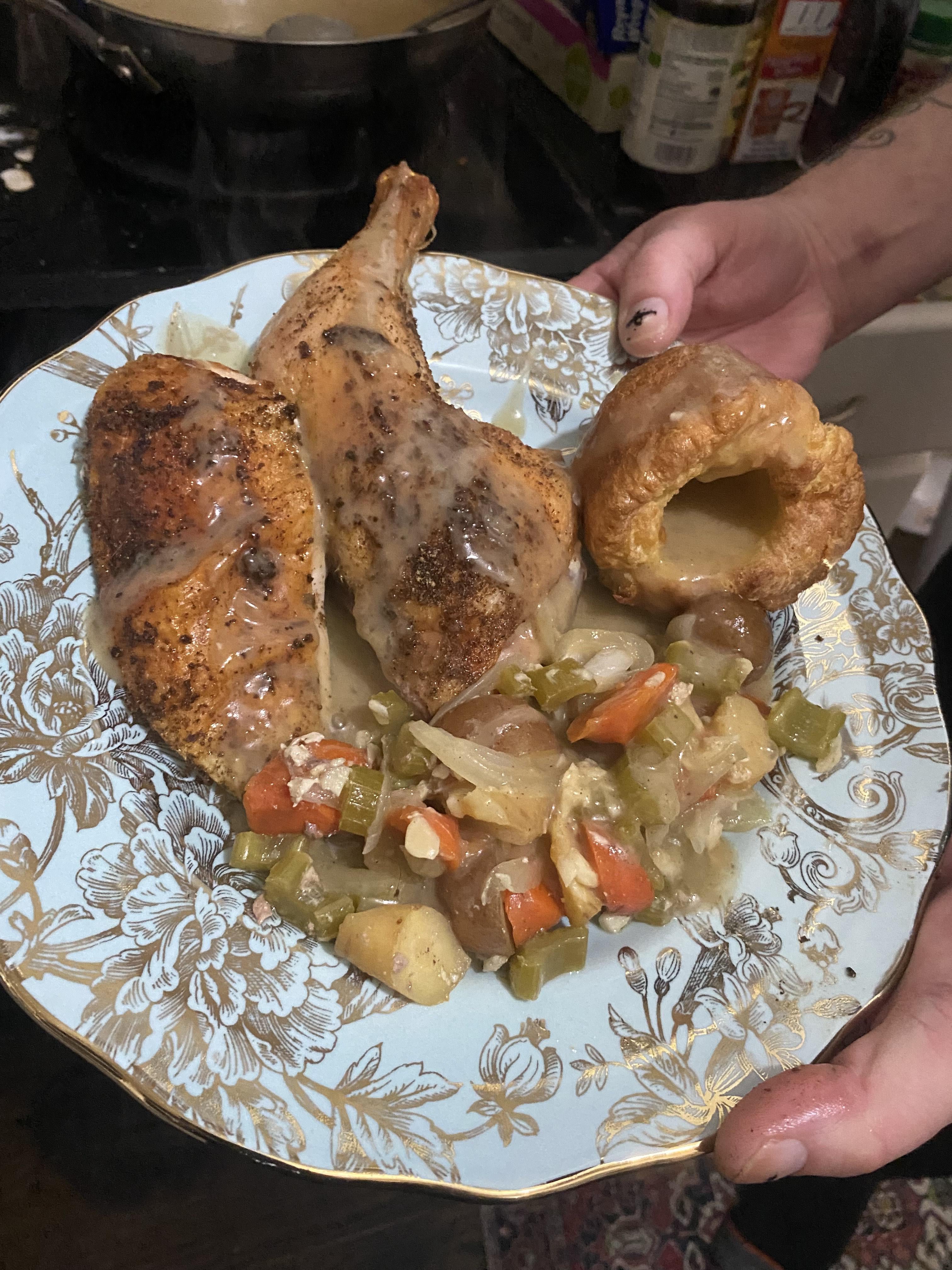 [Homemade] Roast chicken and veggies with yorkshire pudding (an american’s attempt)