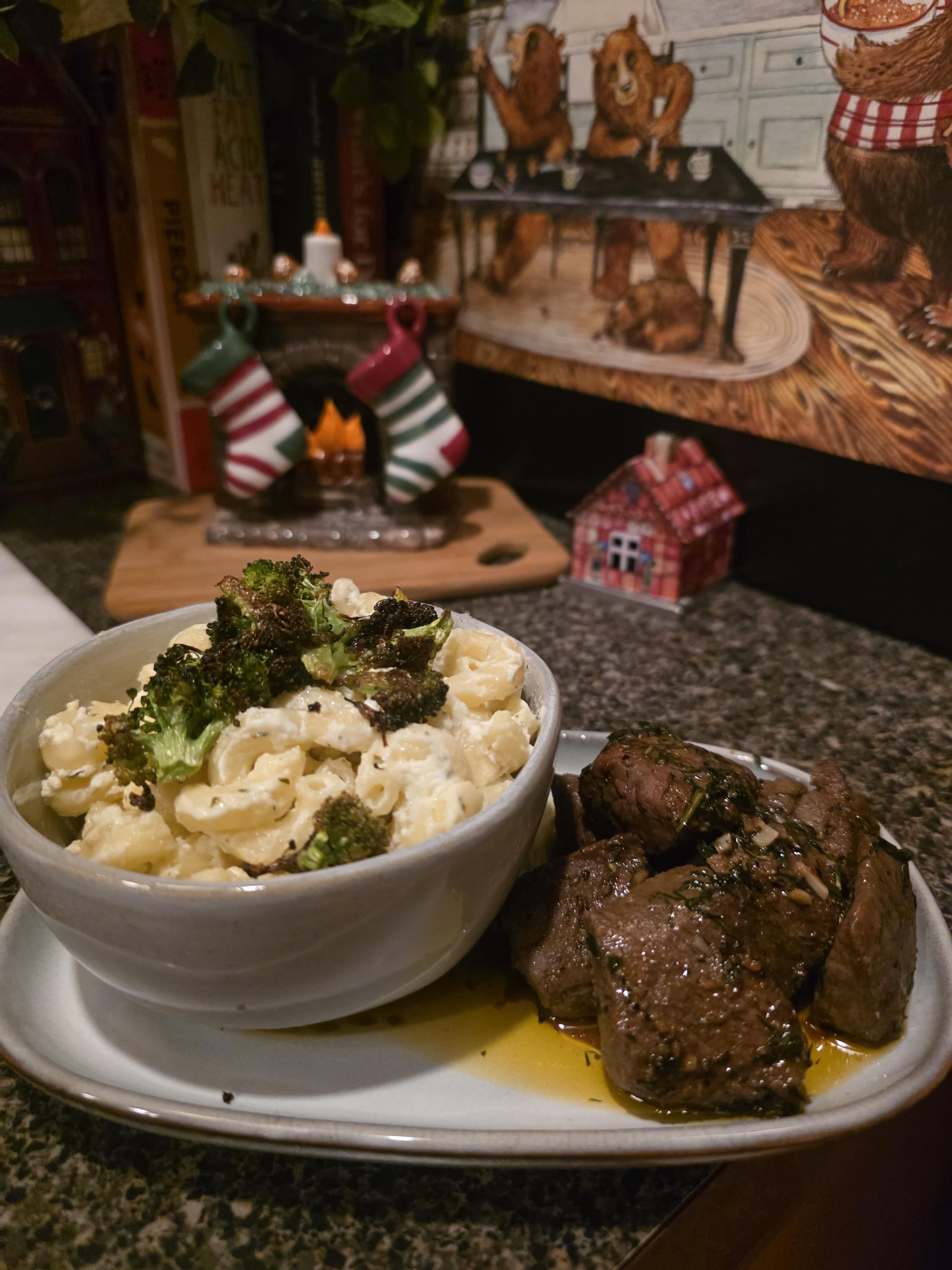 [Homemade] Garlic Dill Butter Steak Bites with Truffle Mac & Cheese Covered by Black Garlic Salted Broccoli by TheRealSim1 Food
