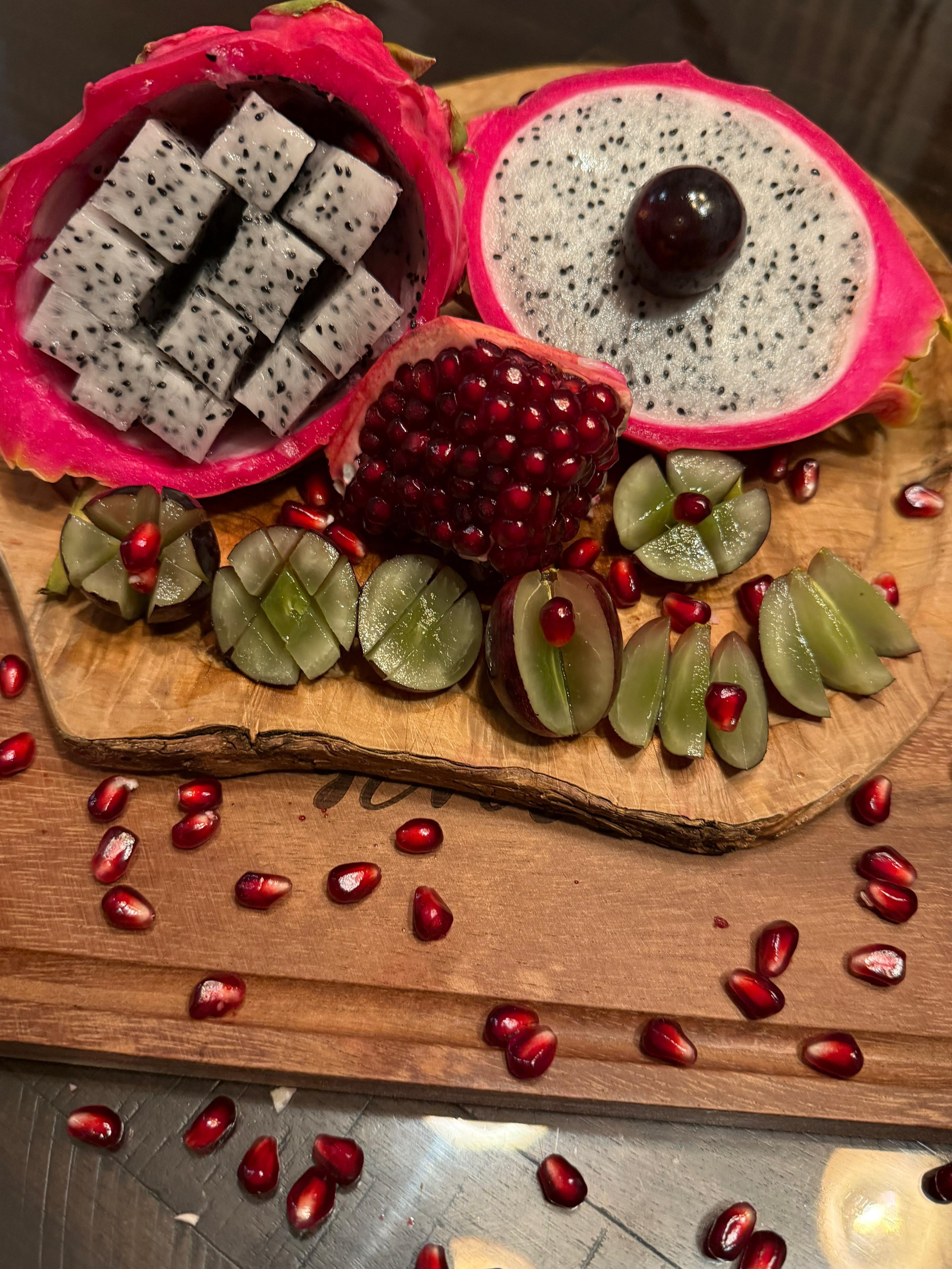 Used 1 dragon fruit, half a pomegranate, and a handful of green grapes. I cut the dragon fruit in half, cubed the inside of one half and put the cubes back into the shell, and left the other half whole. Halved the pomegranate and knocked out some extra seeds. Sliced the grapes and spread everything out on a board, then sprinkled the pomegranate seeds over the top. You can add a little honey and a squeeze of lime at the end if you want.