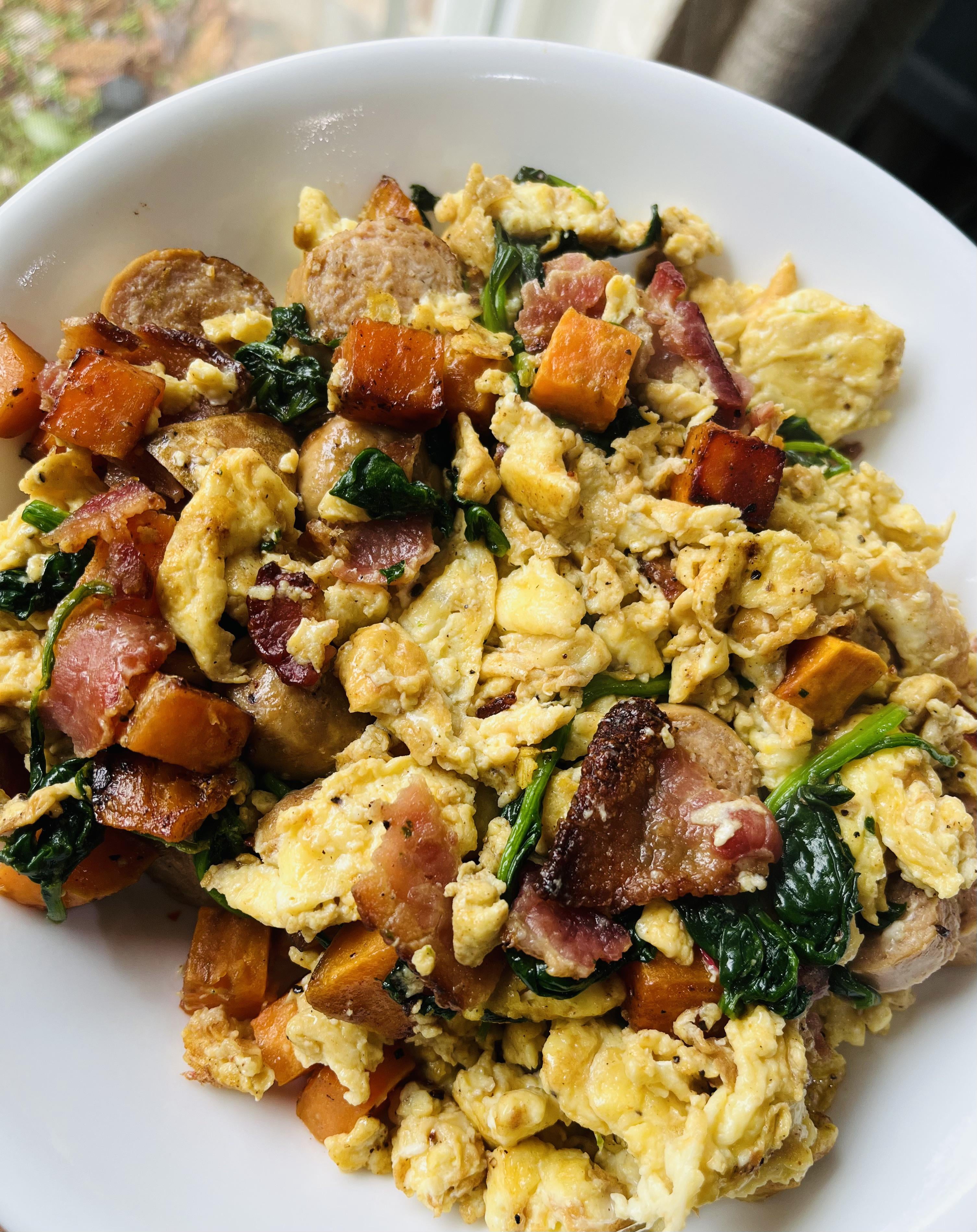 Chicken sausage, bacon, spinach, sweet potato seasoned with maple bourbon seasoning and egg breakfast scramble.