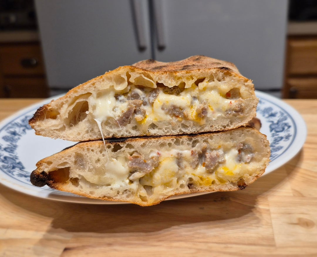Neapolitan dough cold-fermented overnight. Filled with spicy Italian sausage, mozzarella, and ricotta. by cucinaforte Food