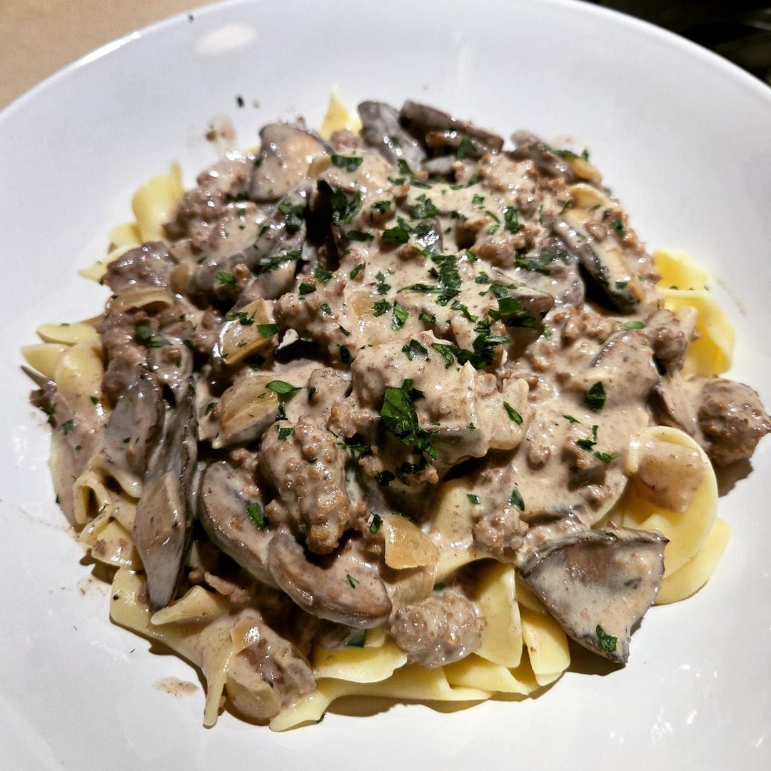 Greek Youvetki with Pork. Tomato Based Pork Stew Served with Spinach and Garlic Orzo. Finished with Mint and Feta.