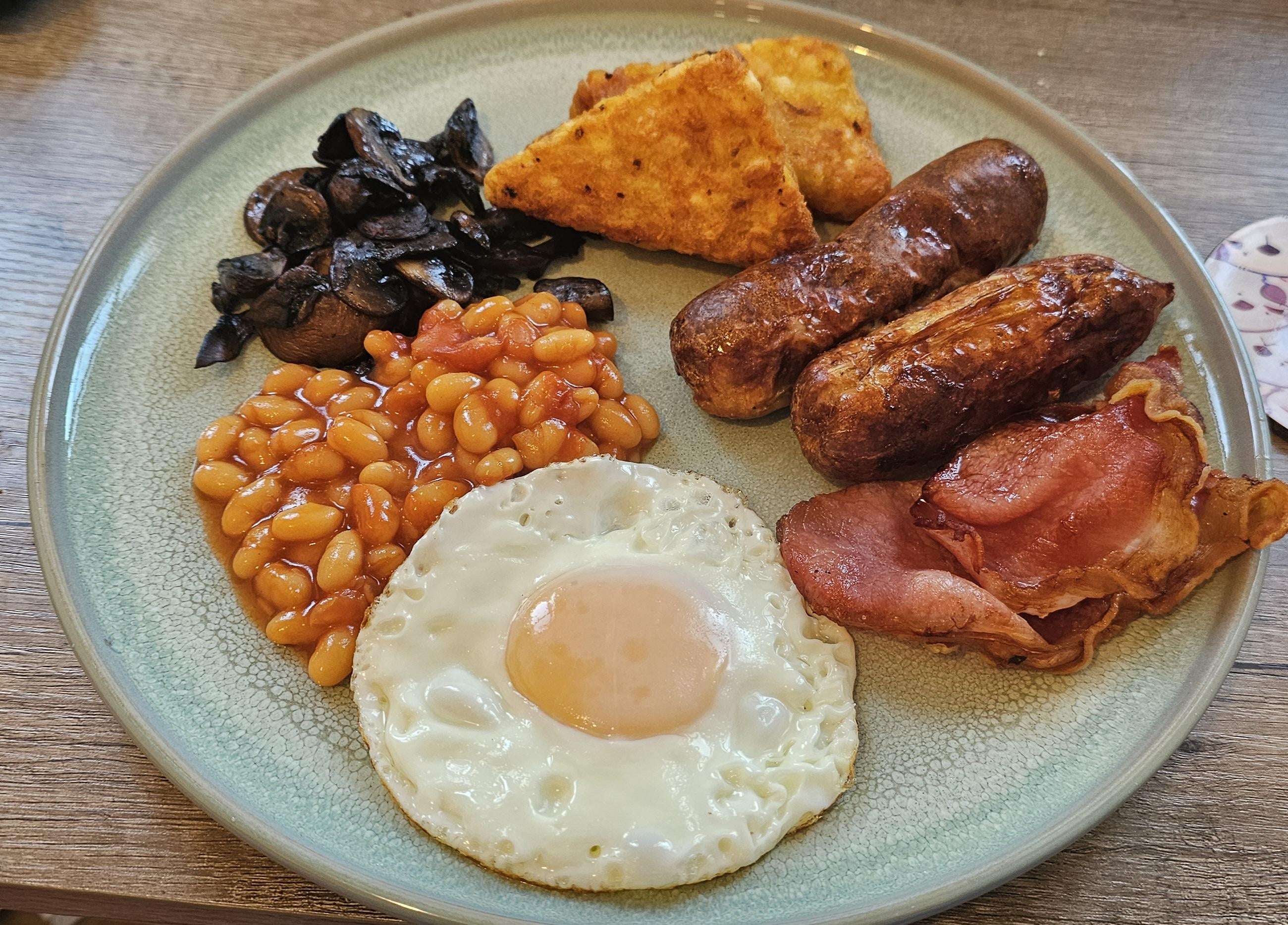 [Homemade] Breakfast – Sausage, bacon, beans, mushrooms, hash brown and an egg by CookingDovahDuck Food
