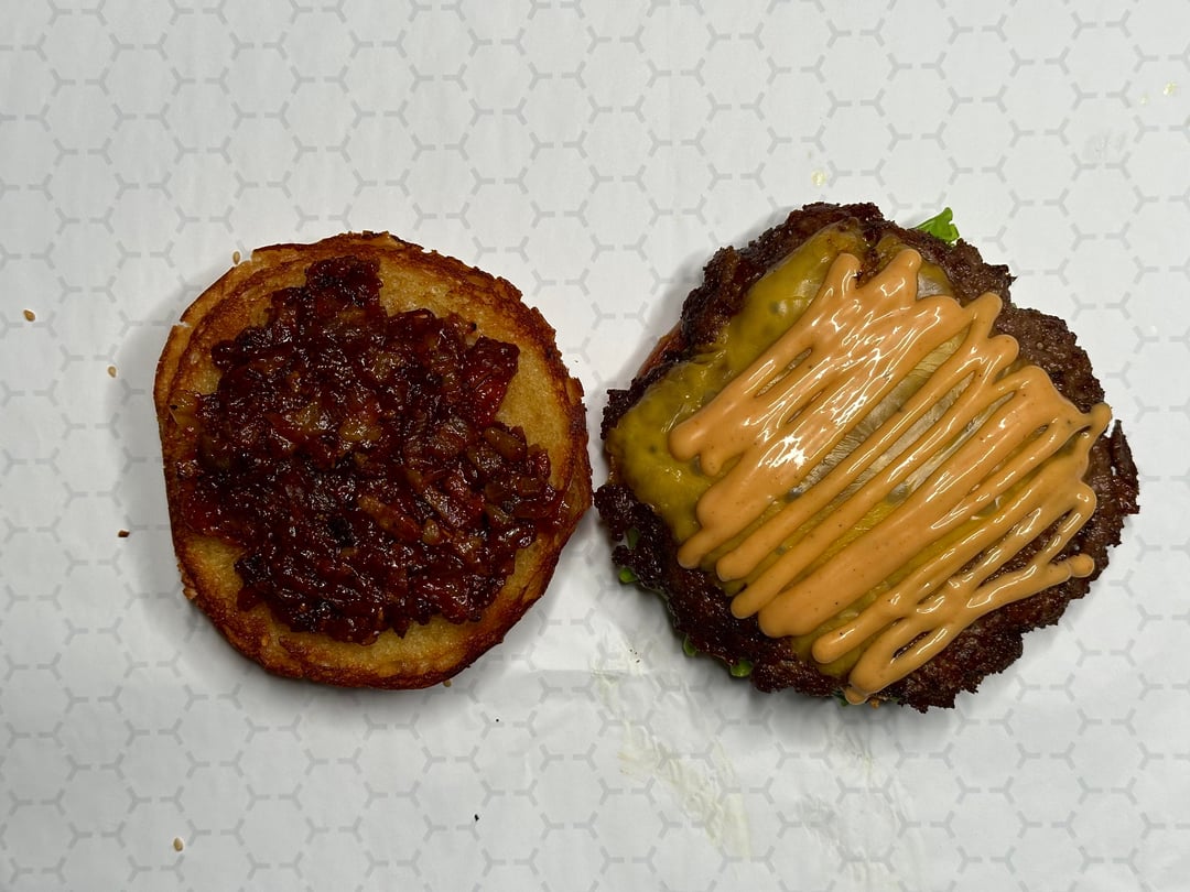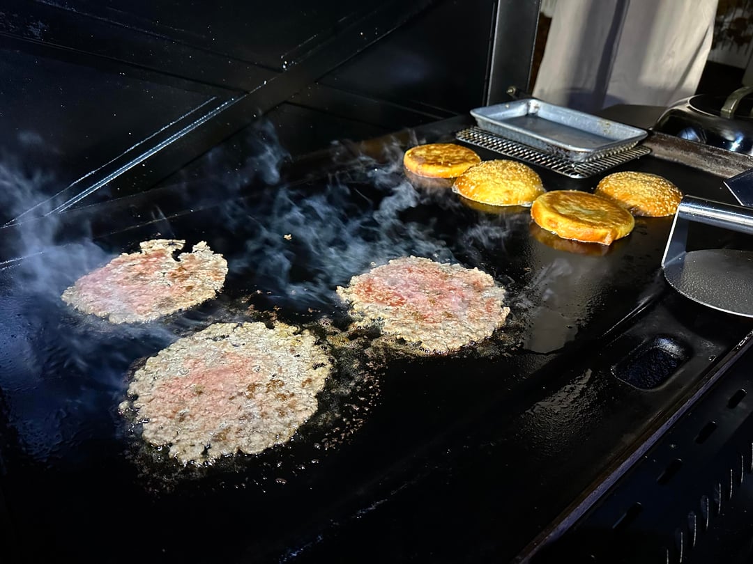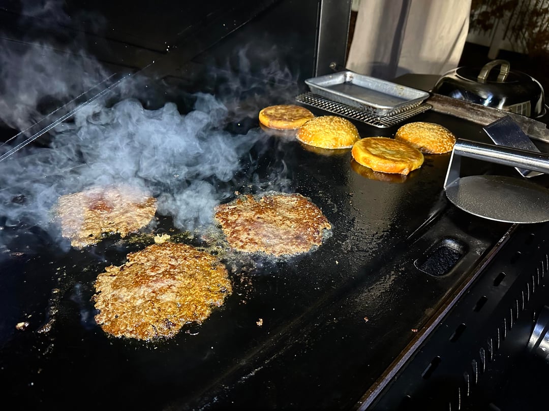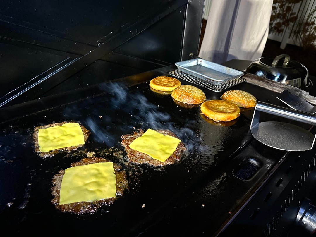 Burger night! This week’s special had home ground chuck, sirloin, and brisket smash patties, American cheese, caramelized bacon and onion with BBQ sauce, homemade pickles, and my sweet and zesty sauce, on a buttered and griddled homemade bun.