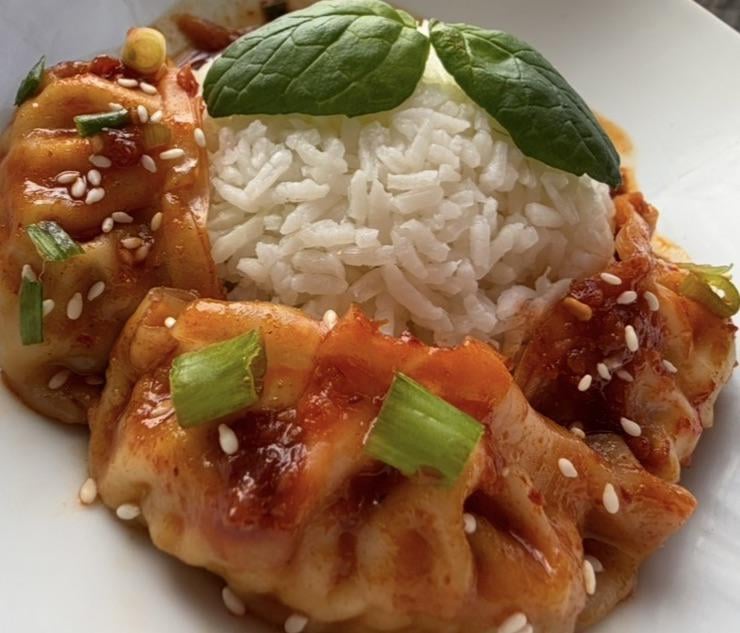 Dumplings in a Basil Red Curry over Rice