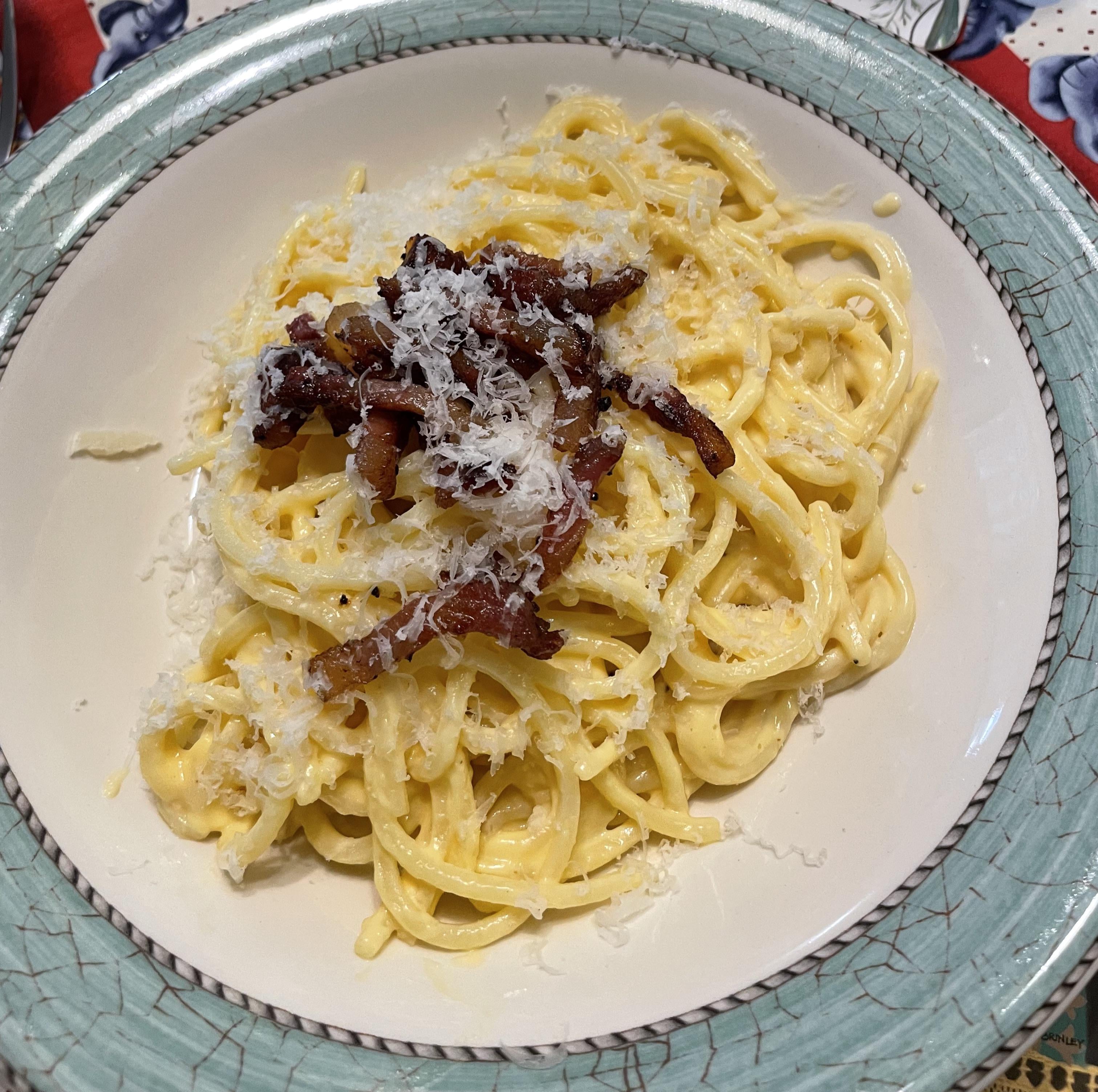 Add rendered bacon fat to egg and Parmesan mix, add 150-200mL of the cooked pasta water to this slowly whilst mixing to temper the mixture