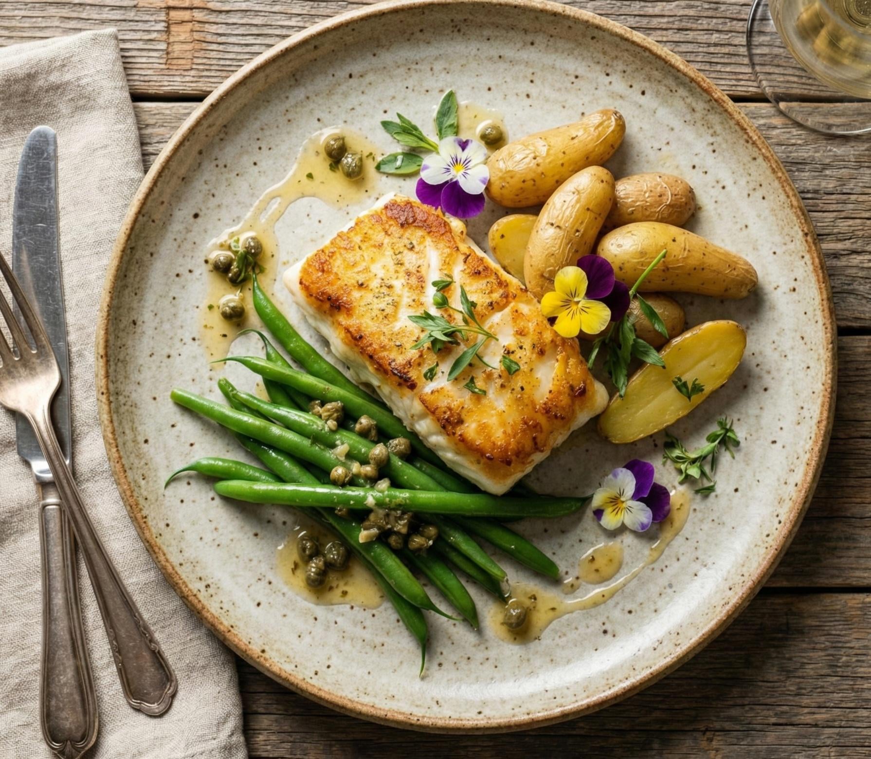 Pan-Seared Alaskan Cod with fingerling potatoes, green beans, and lemon butter sauce.