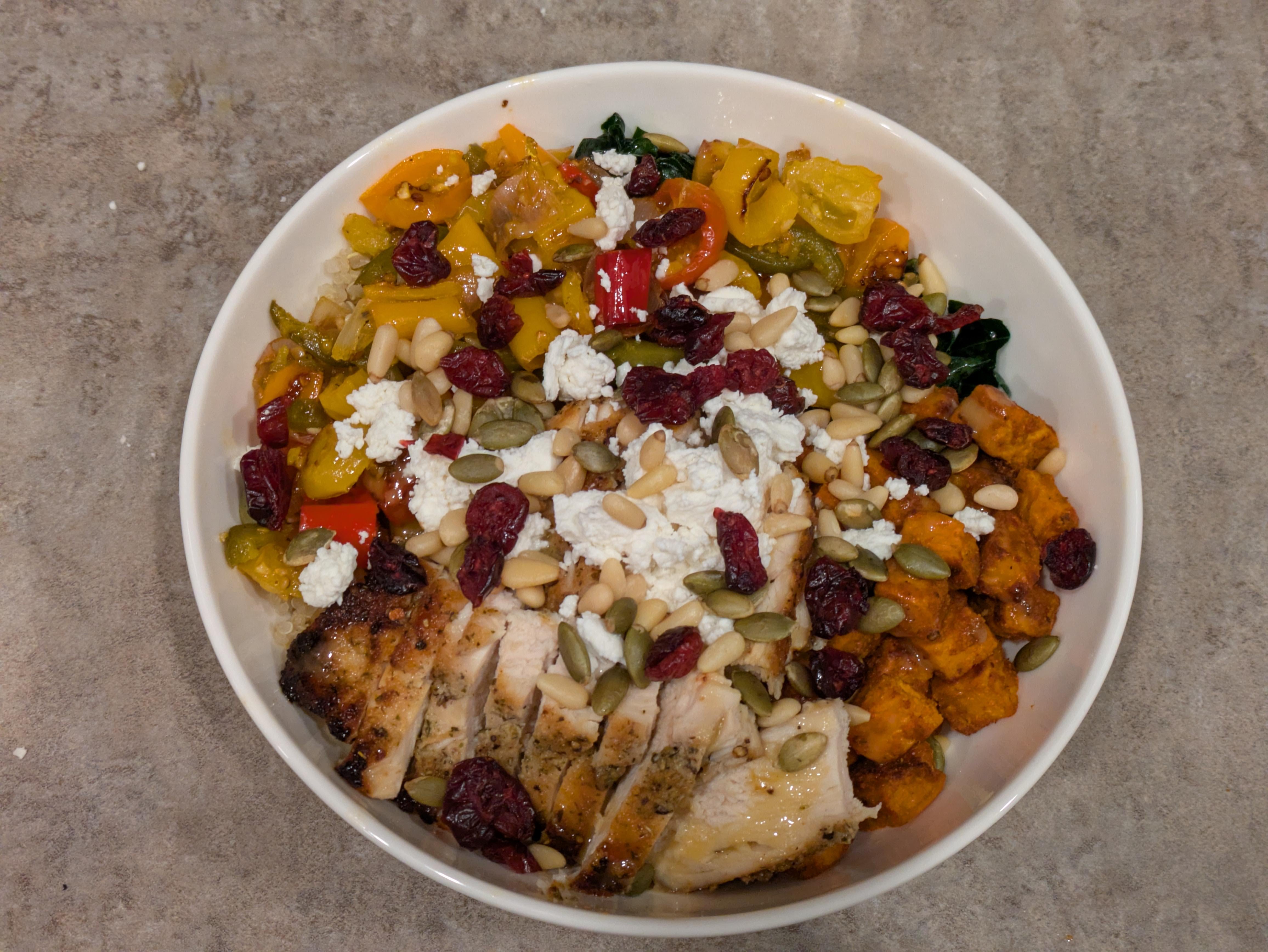 Base: Garlic & herb roasted chicken breast, quinoa, kale, oven roasted sweet potatoes, sheet pan vegetables with olive oil & garlic