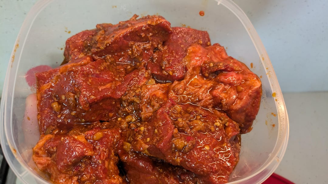 Dry toasted spice mix of salt, pepper, bay leaf, cardamom, coriander seeds, rosemary, lemon thyme, and gochujang chilli paste. Apply it to the beef chunks and marinade them for ~1.5 days.