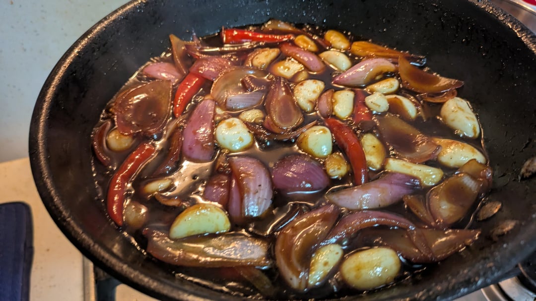 After 1.5 days, sear the meat chunks. Once done, in the same pan, deglaze with cooking wine (any type; I used sake), then add a bunch of garlic, Thai red chilli, onion, soy sauce, and 1 tablespoon of beef stock. Once it’s cooled, blitz it into a paste and reapply it to the seared meat chunks. Then keep the whole mixture in the fridge for another day.