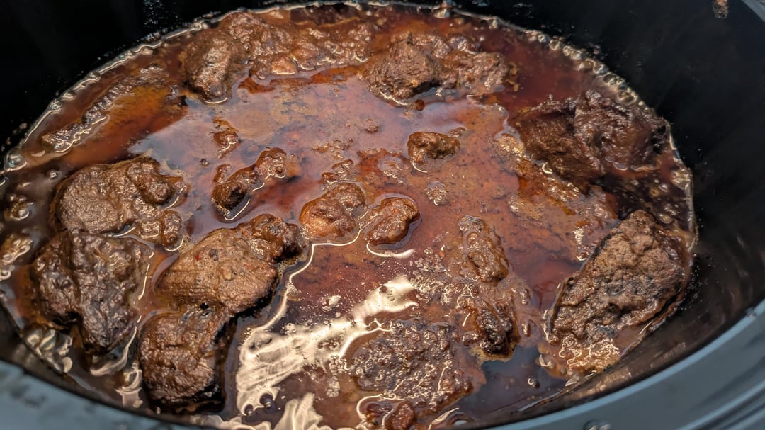 On the third day, put them all in the crockpot on low for 7 hrs. You should be able to pull the beef apart easily, without any resistance. Separately store the pulled beef and the gravy.