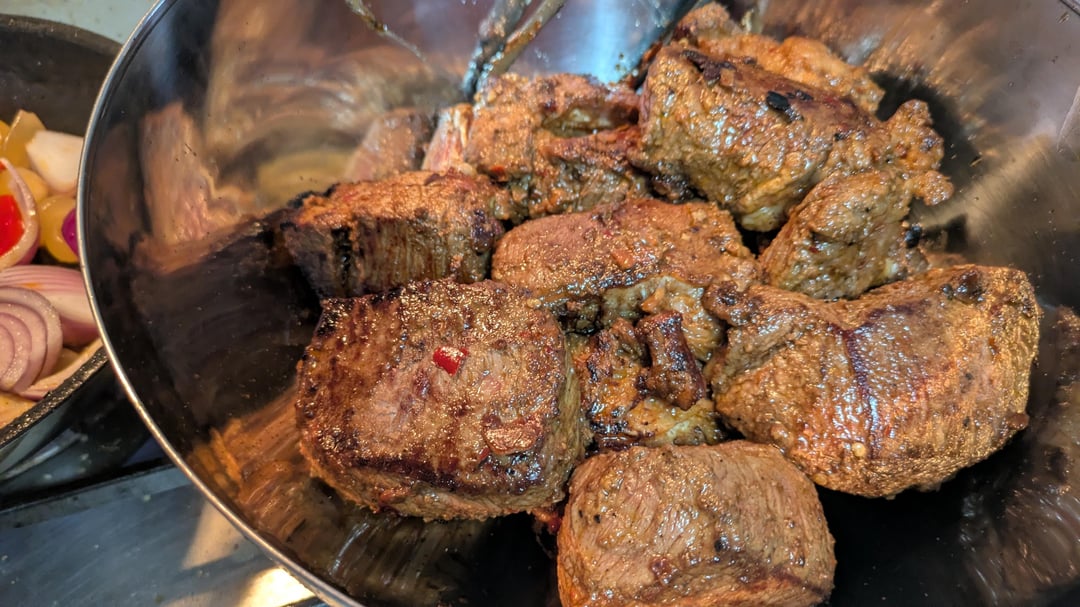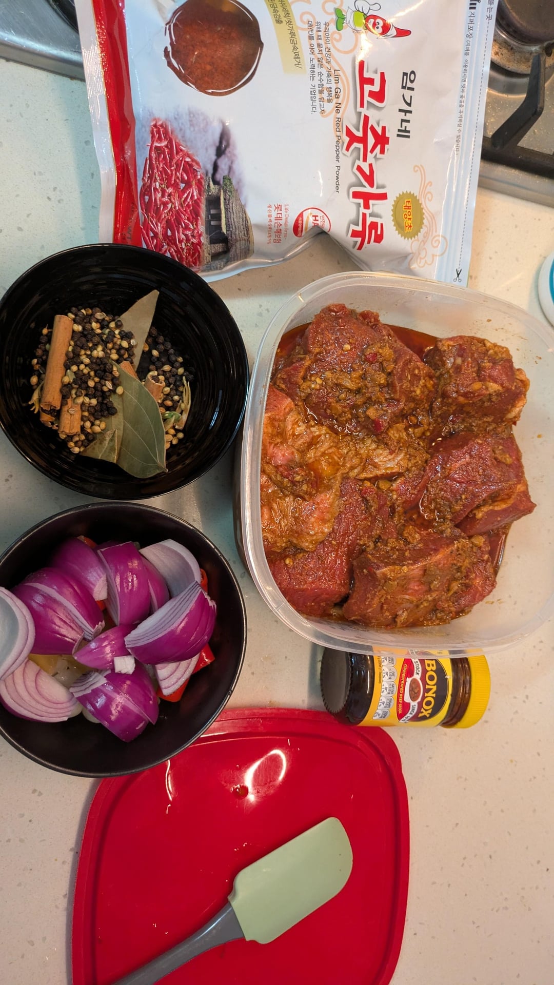 Dry toasted spice mix of salt, pepper, bay leaf, cardamom, coriander seeds, rosemary, lemon thyme, and gochujang chilli paste. Apply it to the beef chunks and marinade them for ~1.5 days.