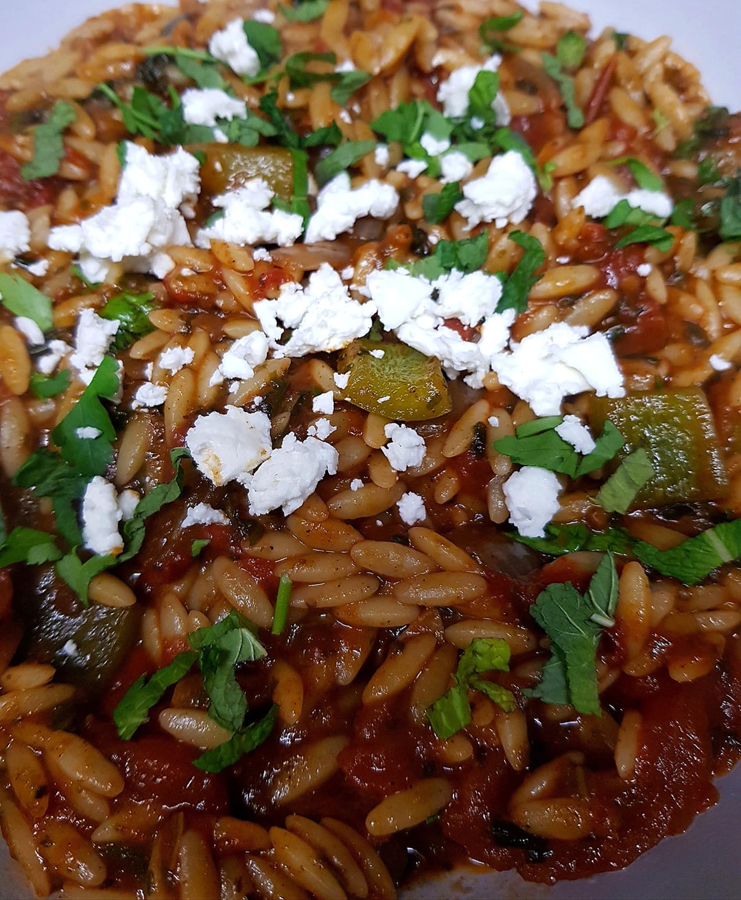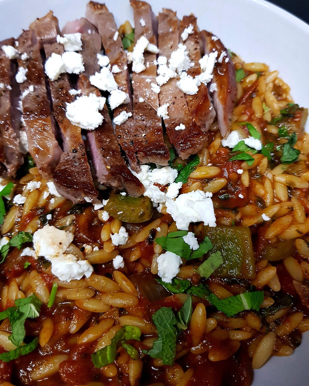 Play on Greek Giouvetsi/ Youvetski, Inspired by Another Redditor. Orzo Pasta in Tomato Based Sauce with Mint and Parsley, Quick Seared Lamb and a little Feta. A Squeeze of Lemon to Finish.
