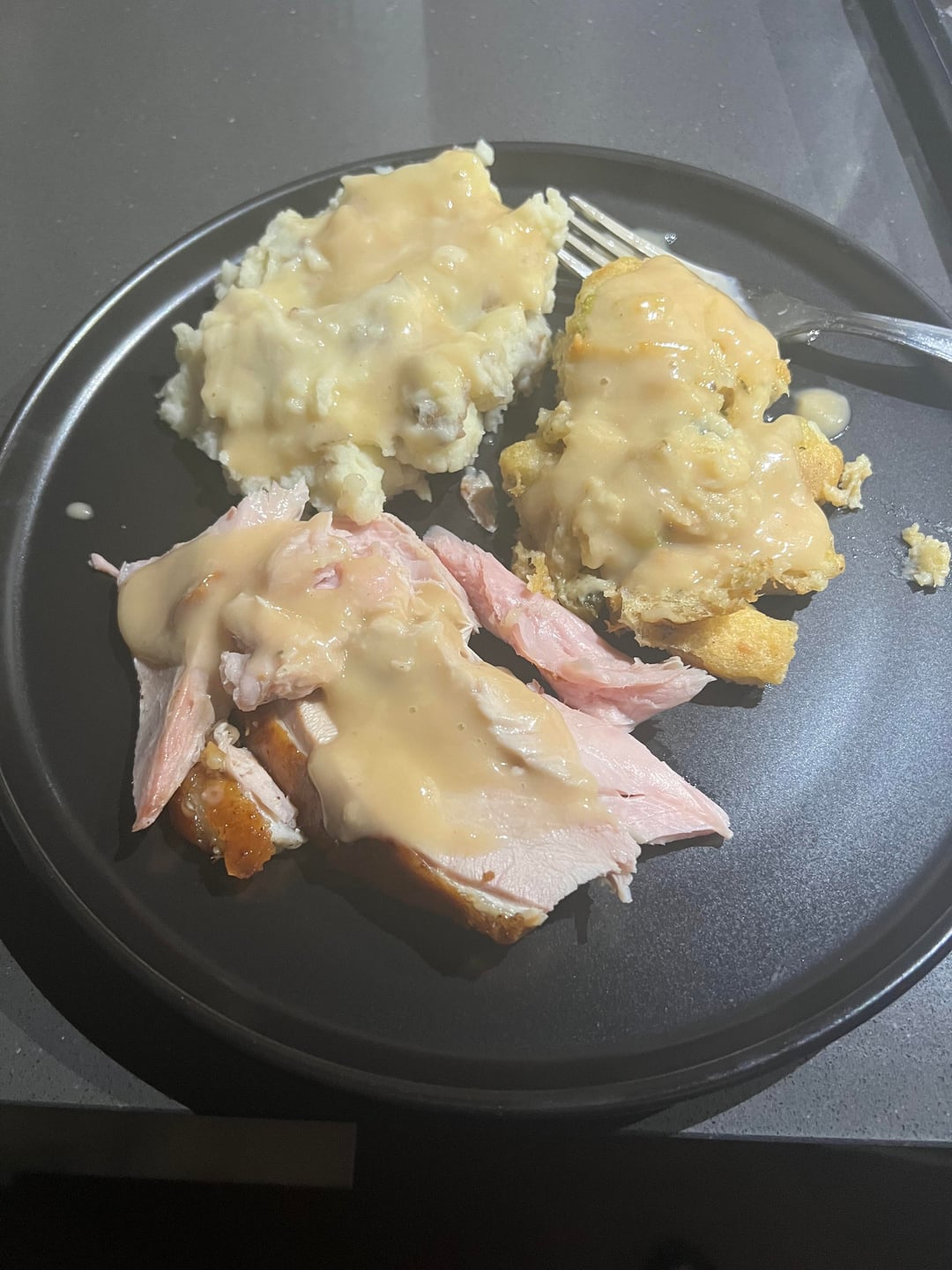 Gravy is homemade that I got for free at the local farm/butcher. Will be using the drippings (I had drained these already) and leftover gravy to make some homemade stock in a few days!