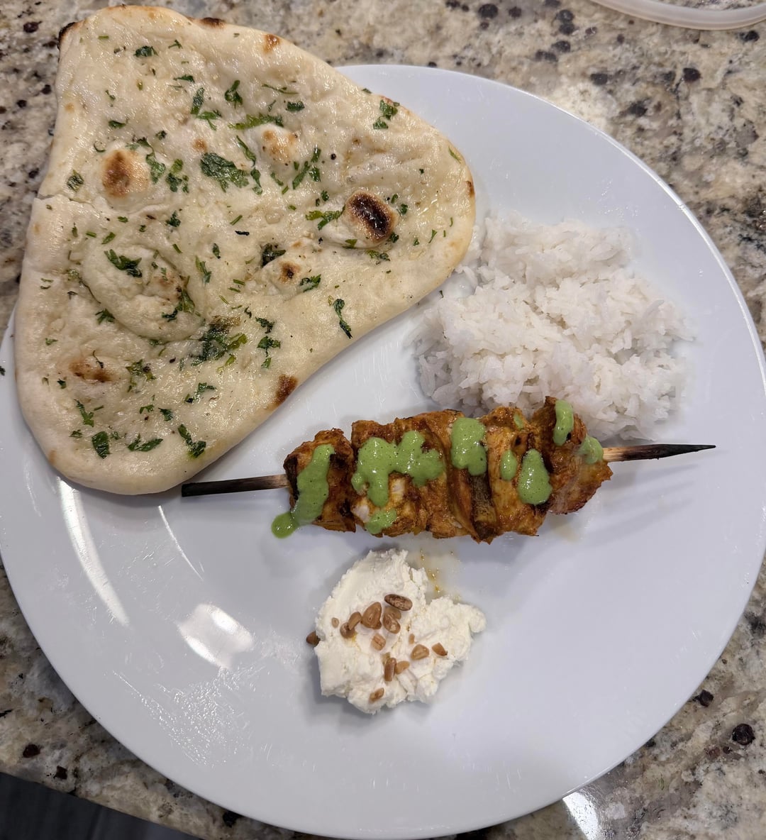 3. Chicken Tikka Kebabs with basmati rice, Naan (the only thing I didn’t make from scratch this week), and leftover Aji Verde and whipped feta.