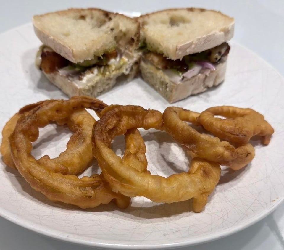 5. Peruvian chicken sandwiches with whipped feta and roasted pine nuts, aji verde, red onions, and smoked Gouda on ciabatta bread.