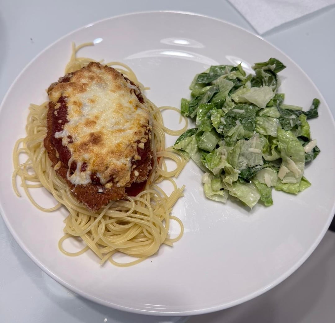 4. Chicken Parmesan with angel hair and Caesar salad.