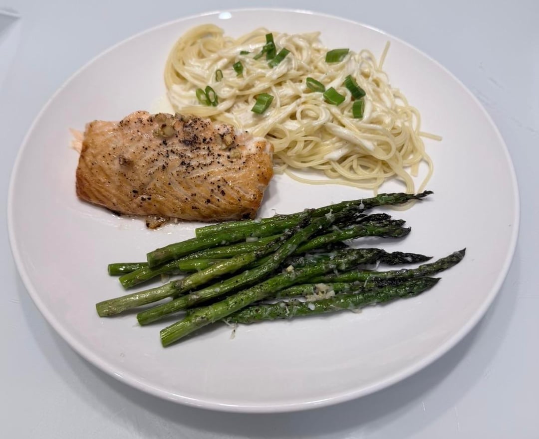 2. Roasted lemon salmon with Caesar salad, asparagus, and smoked cheddar Alfredo.