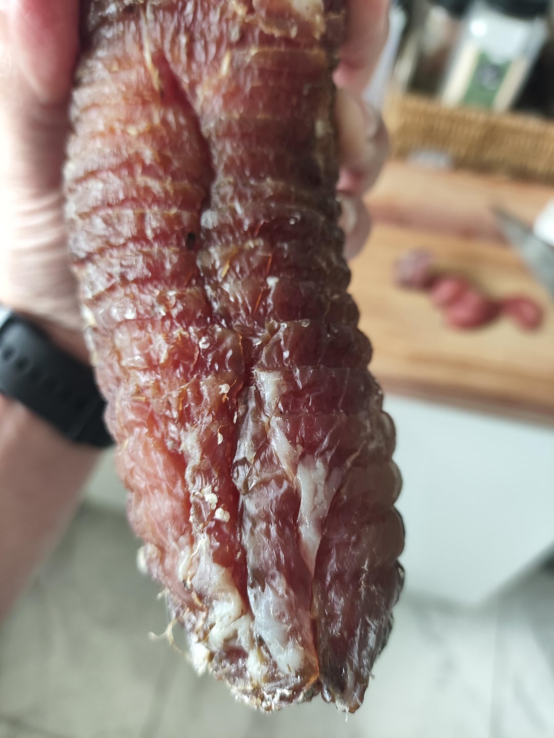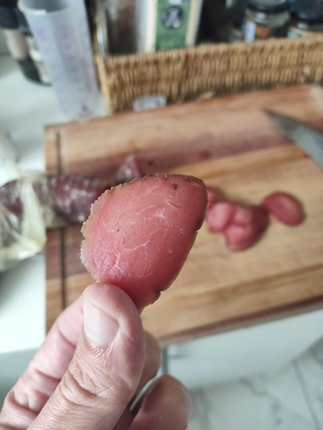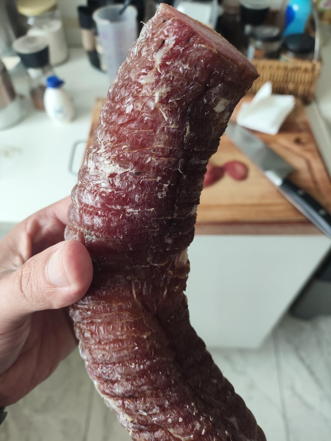 I recently attempted my first dry cure with a piece of pork tenderloin weighing around 850 grams. After roughly 20 days of curing and a weight loss of about 40%, I thought it was ready, so I took it out of the wine cellar where it had been hanging.