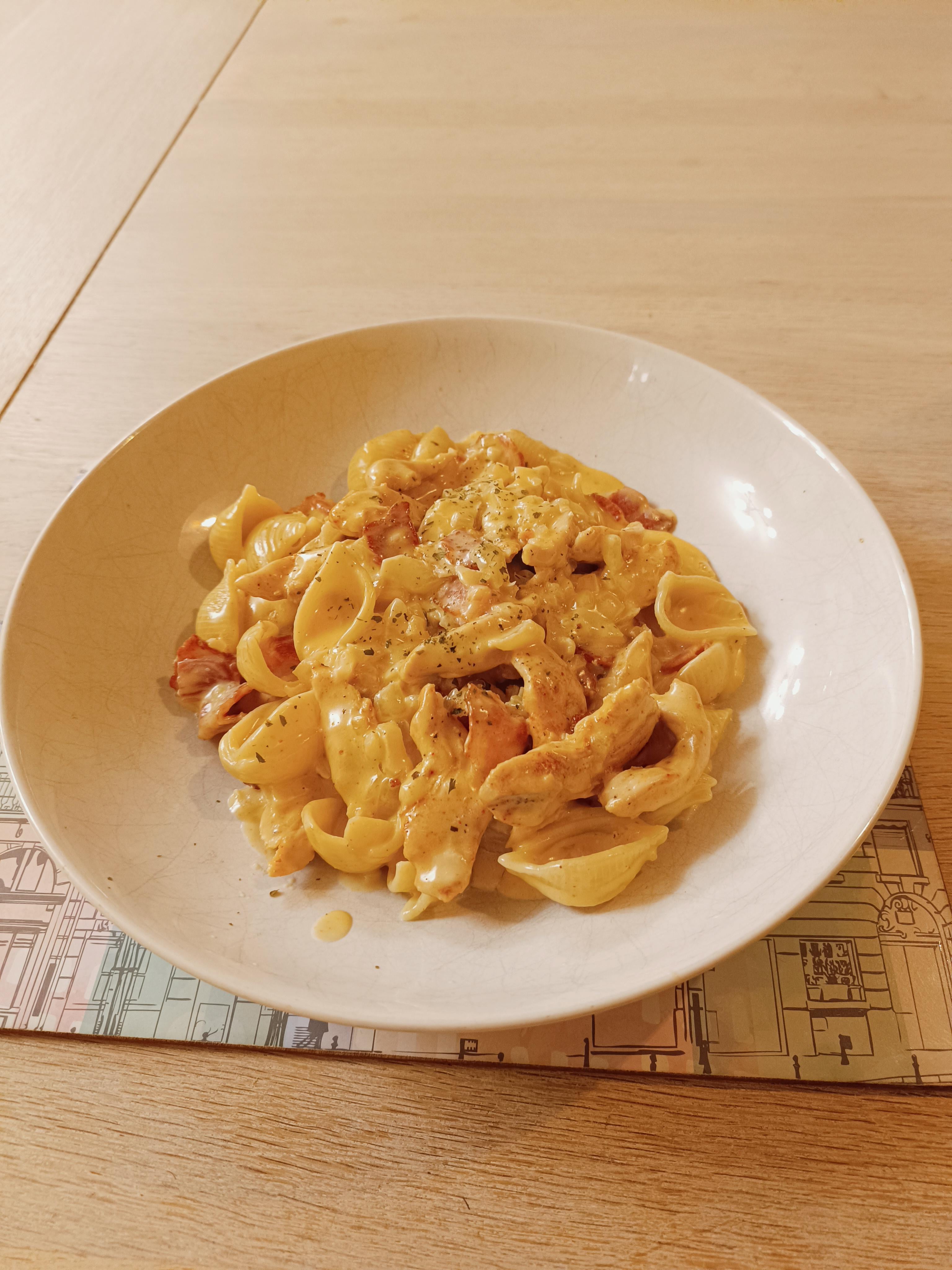 Chicken and smokey bacon with pasta and the sauce is double cream, crème delice cheese and parmesan with a chicken stock cubes and some pasta water. by bonzo-best-bud-1 Dinner Tonight Tonight's Dinner