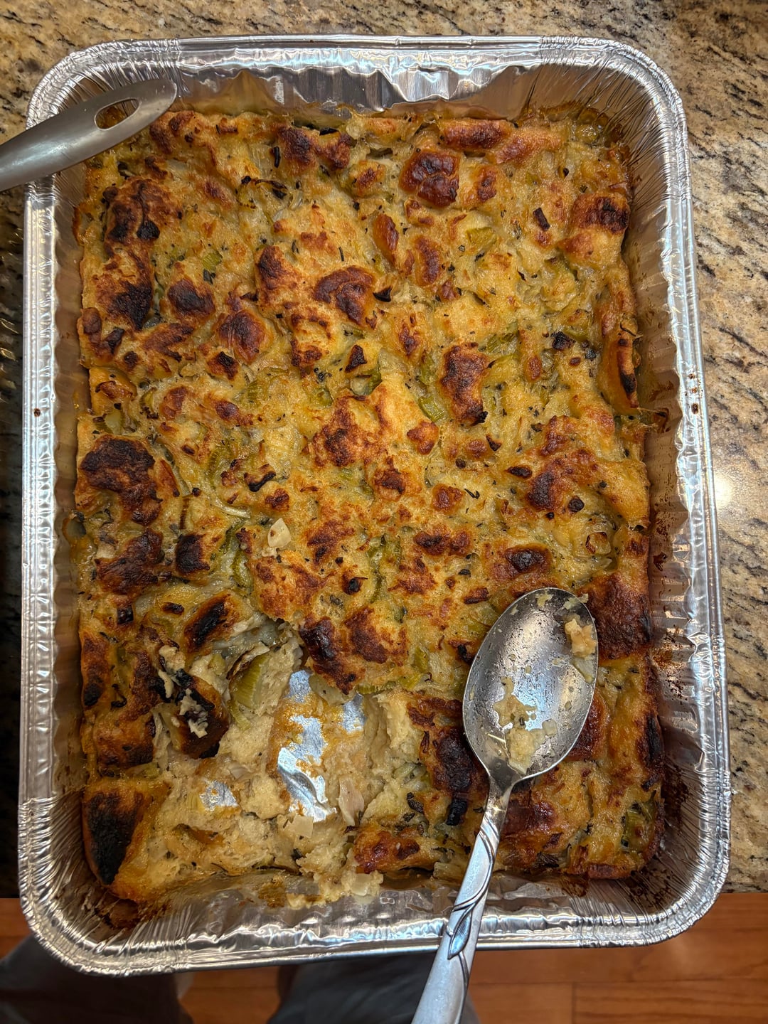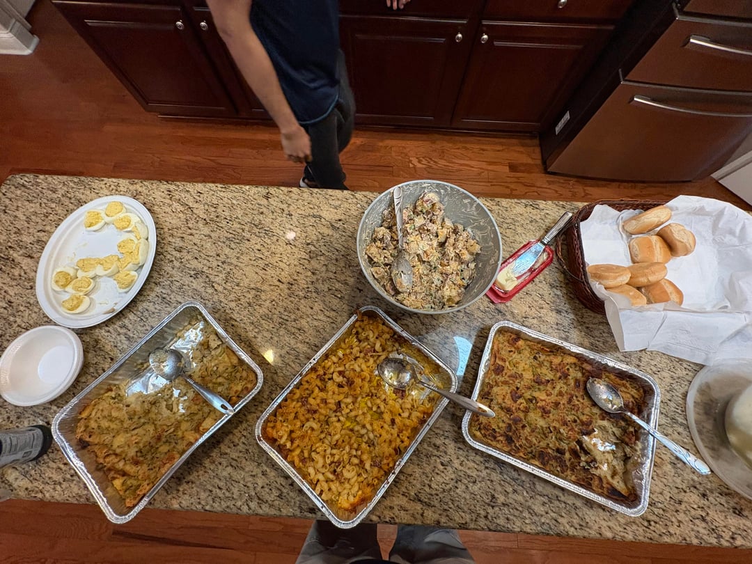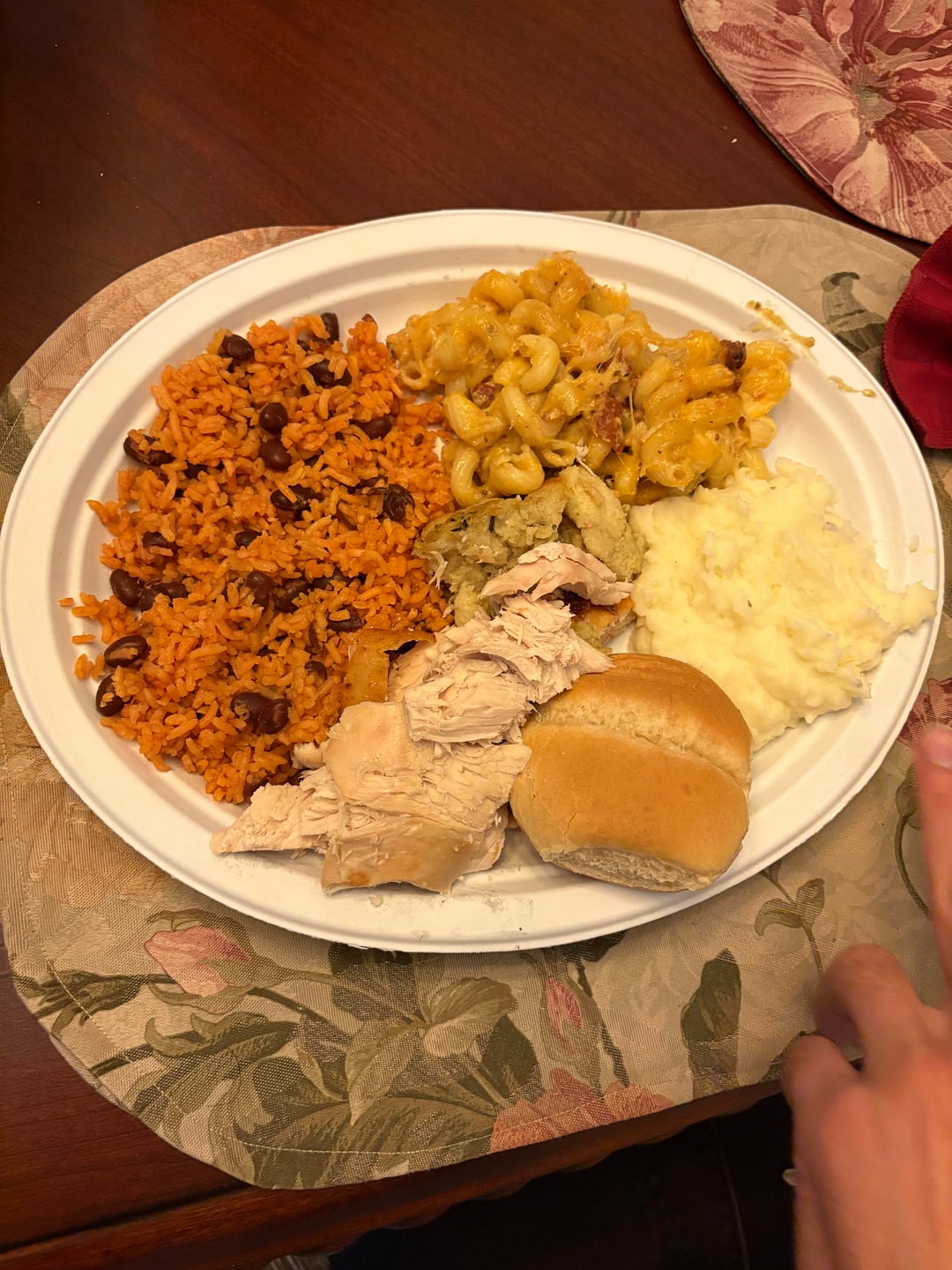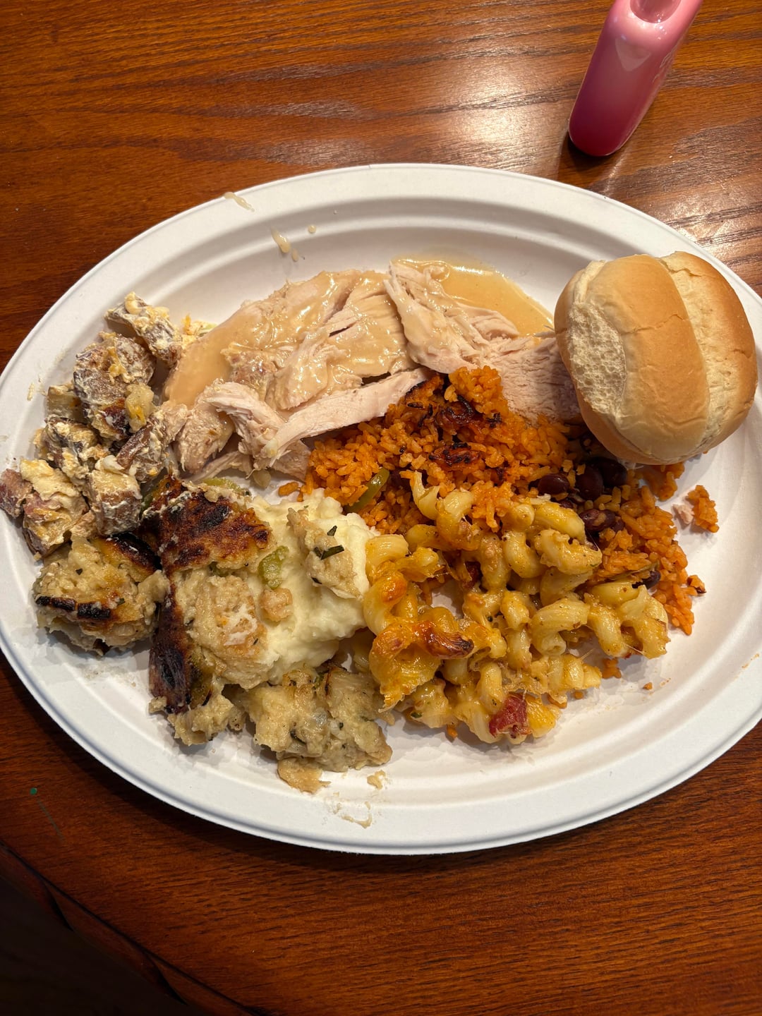 Thanksgiving feast. Stuffing, mash, Mac and cheese, turkey,potato salad,and turkey. Not pictured are a chocolate mousse and lemon pie. Everything homemade