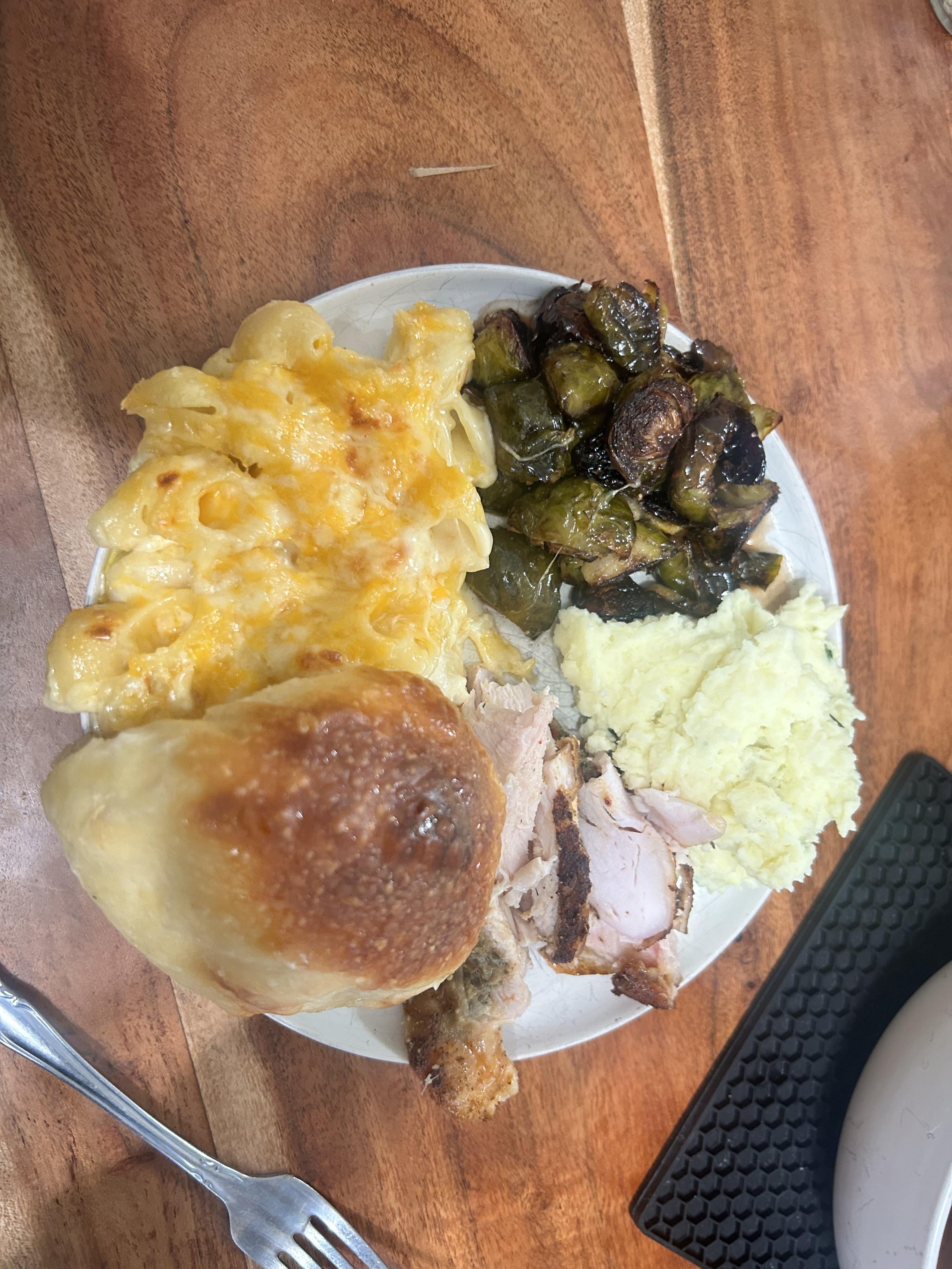 KindheartednessGold2 on November 27, 2025 9:40 pm Smoked turkey, honey butter rolls, baked Mac n cheese, balsamic glaze sprouts and sour cream n chive mashed potatoesÂ