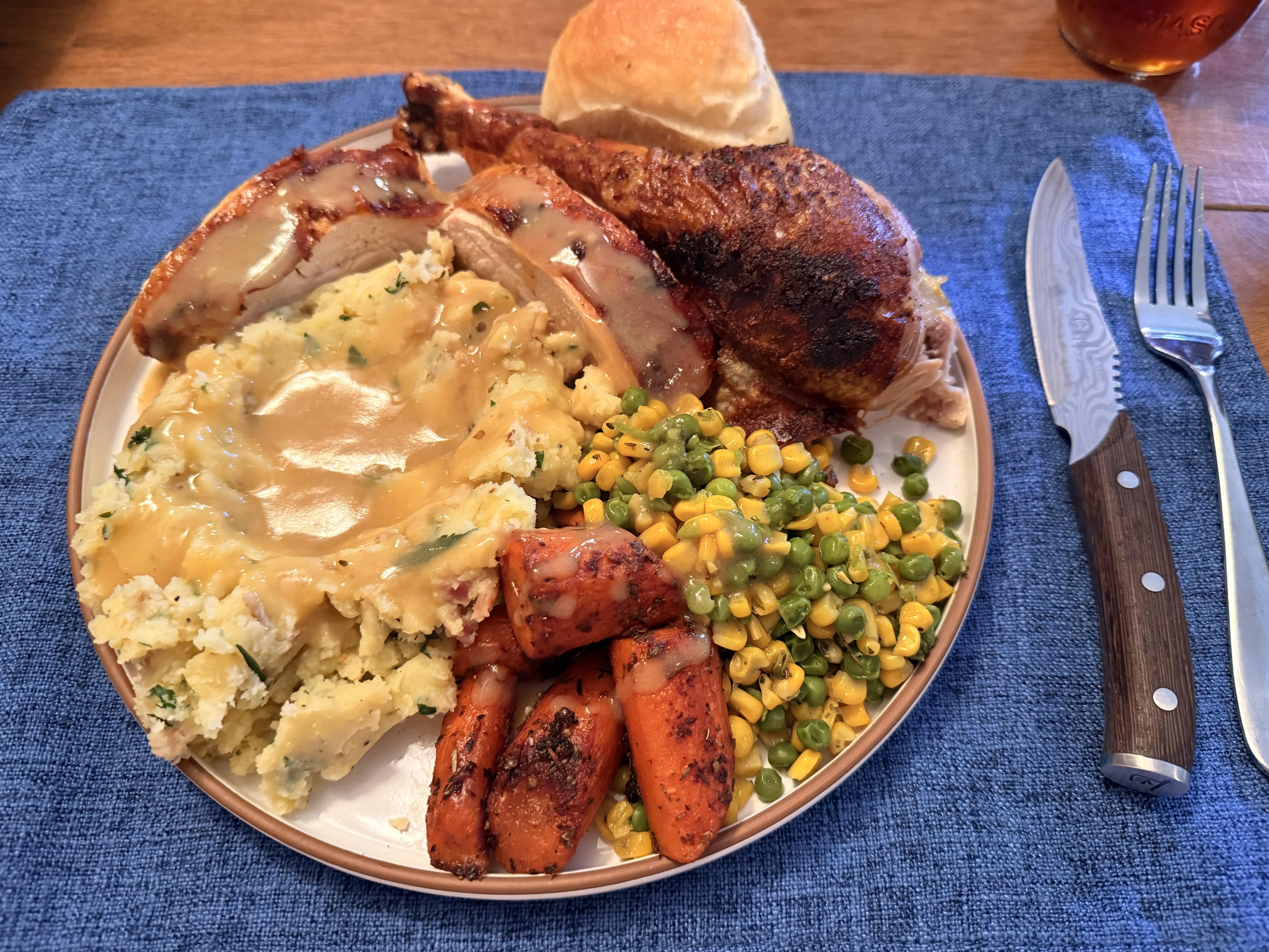 Oven roasted 16lb turkey, dry brined for 24 hours. Bacon Boursin cheese mashed potatoes, peas/carrot medley, cast iron rolls, and bacon fat roasted carrots. Fucking delicious, and I am exhausted from making it lol.